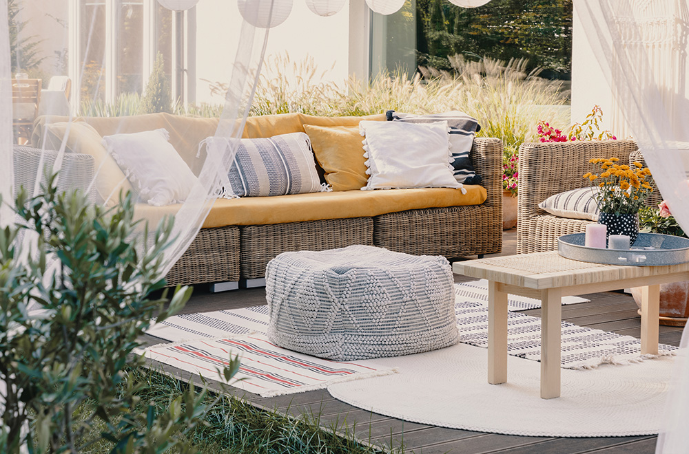 Und die Extras? Wähle feuchtigkeitsbeständige Möbel, weiche Bettdecken, Kissen, Teppiche und warmes Licht, um deine Terrasse zum perfekten Ort zum Entspannen zu machen. Vergiss nicht die stimmungsvolle Beleuchtung!