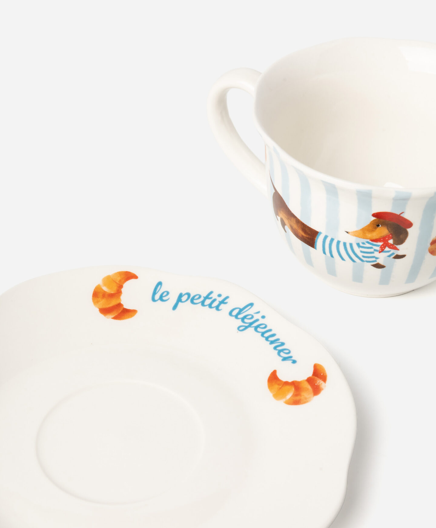 Die Tasse mit Untertasse aus Steingut mit Dackelmotiv überzeugt durch ihr charmantes Design mit einem eleganten Dackel mit Baskenmütze.