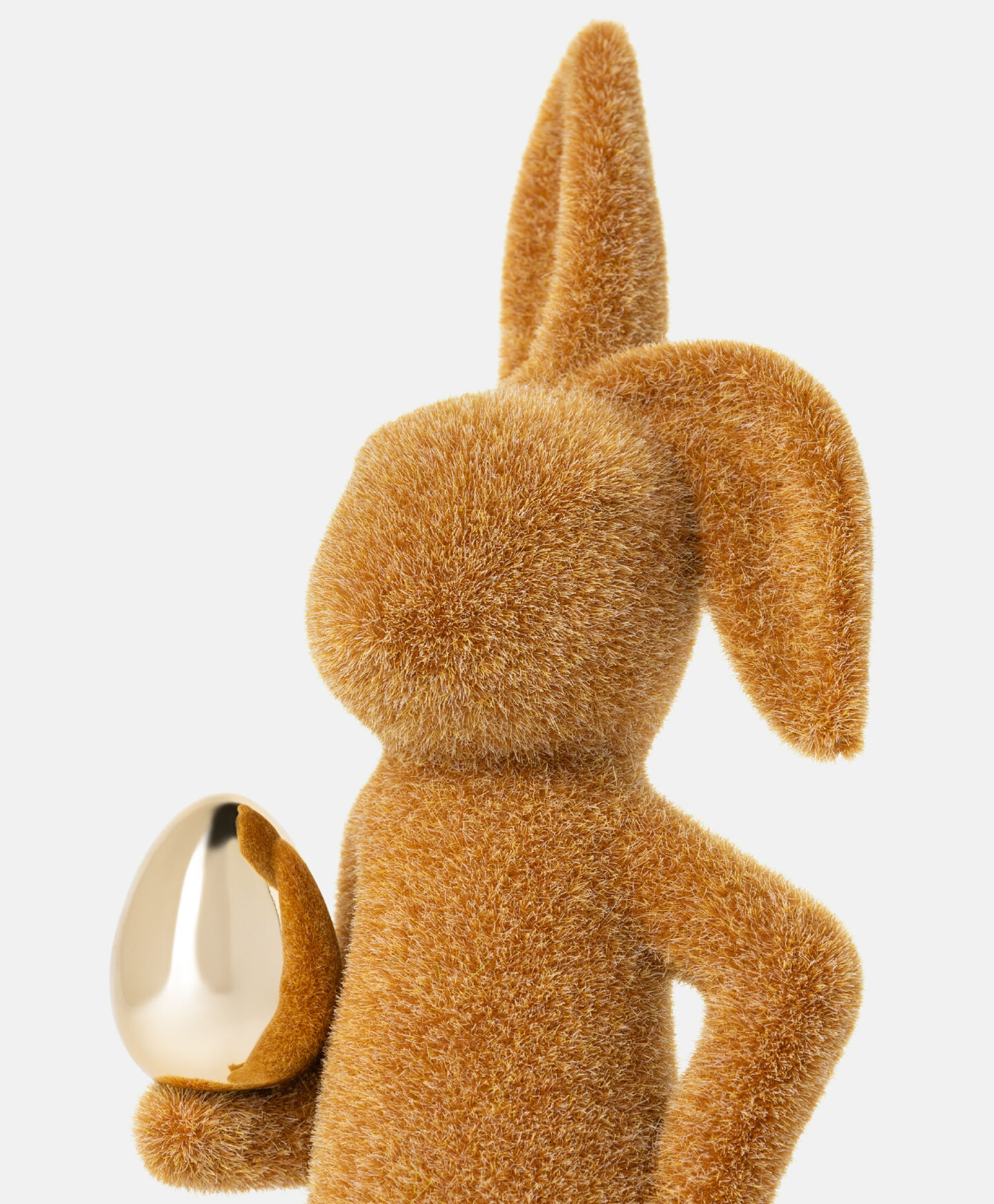 Der beflockte Hase mit goldenem Ei ist eine dekorative Figur mit saisonalem Charakter.