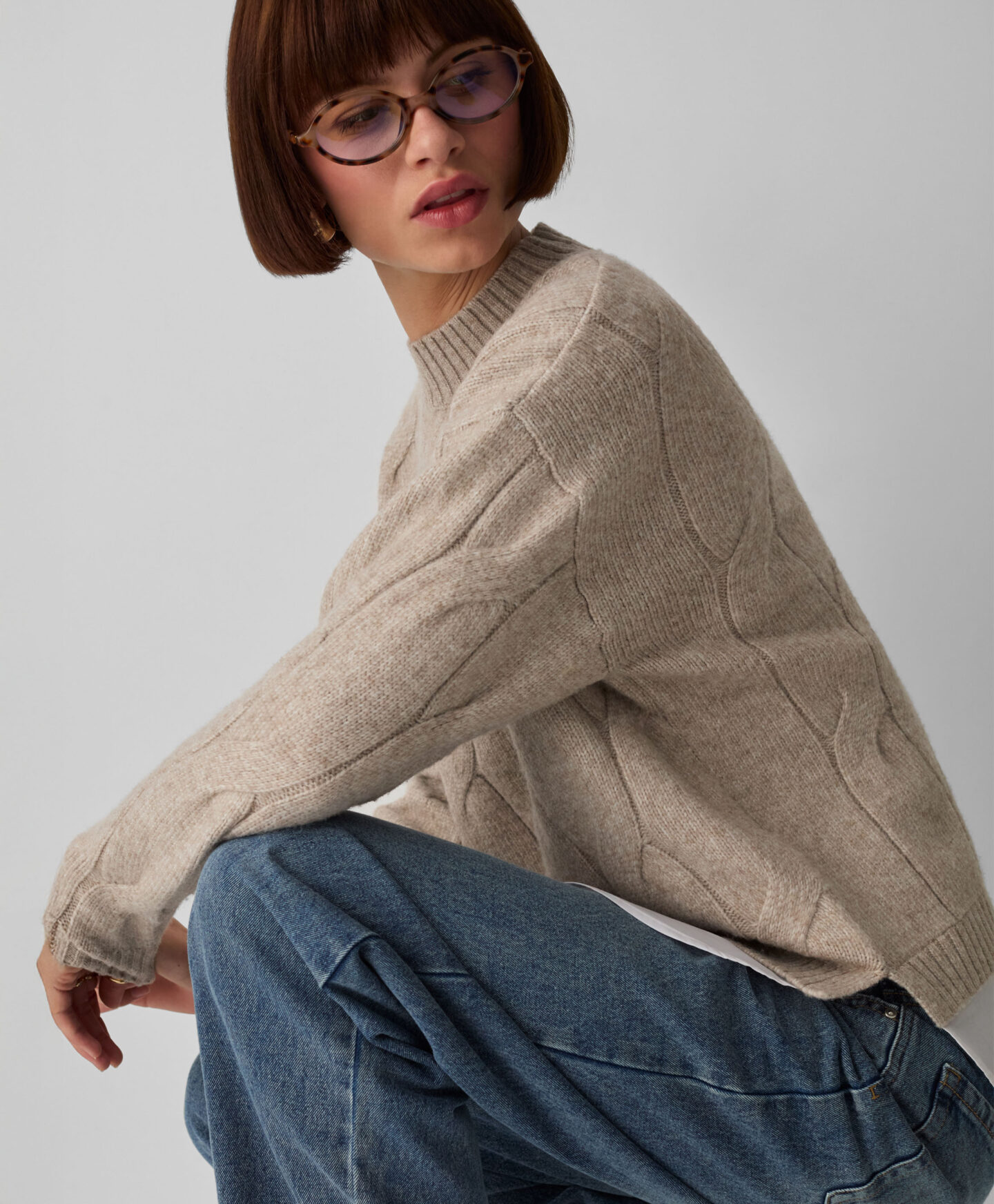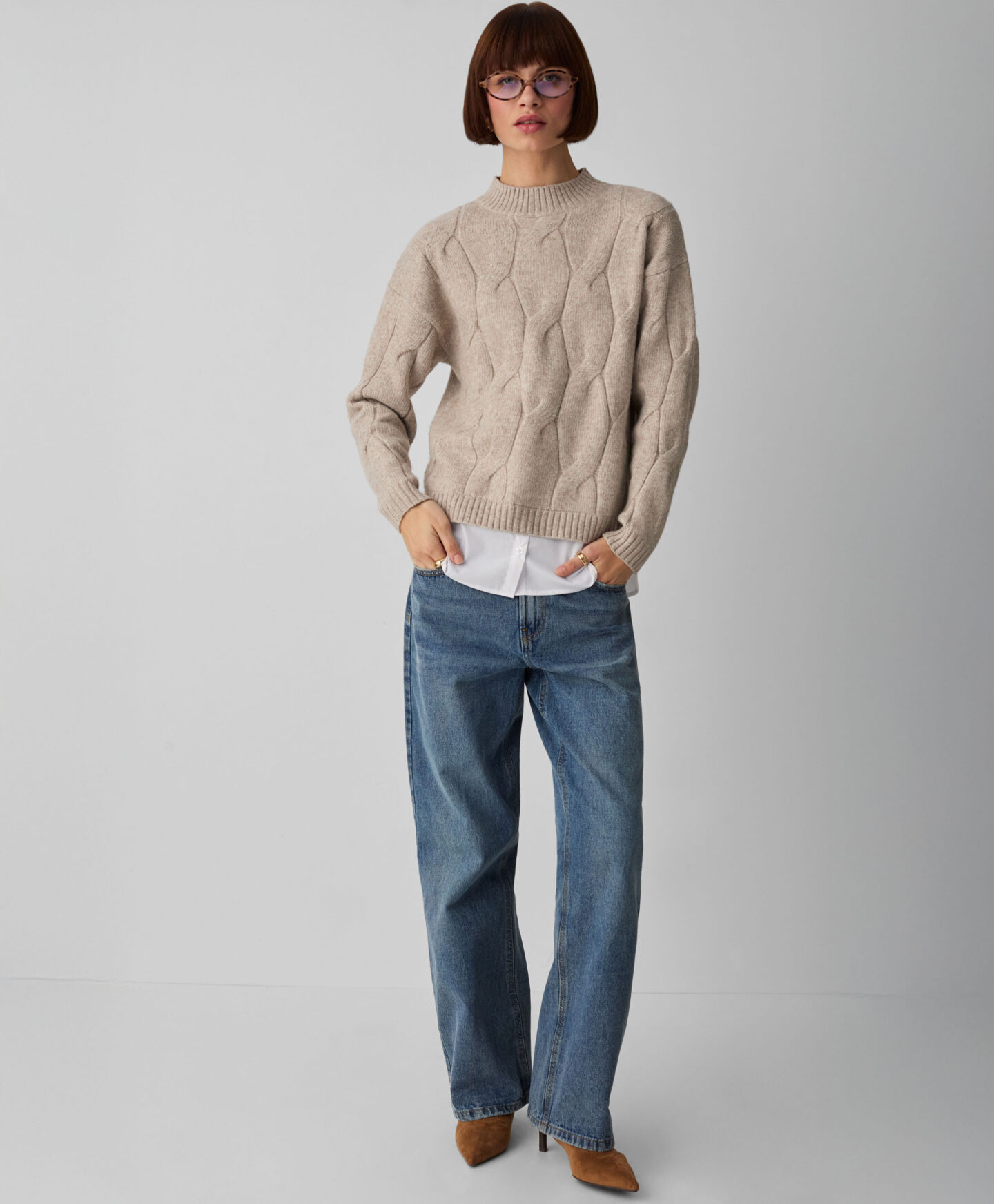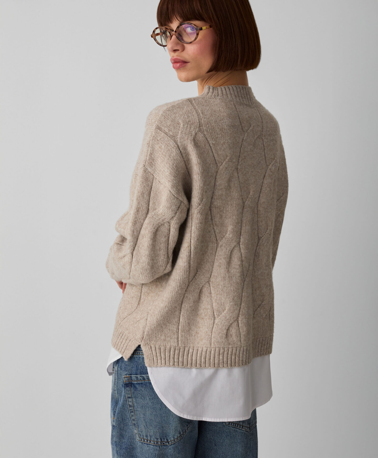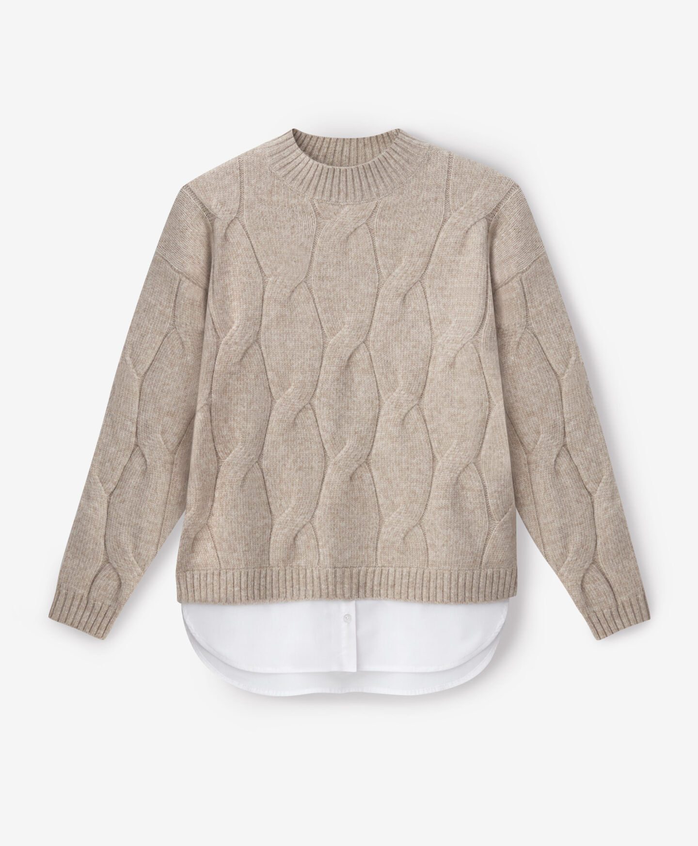 Beiges Sweatshirt für Damen mit Shirt – Für Frauen, die Trends folgen. Das Zopfmuster ist der Inbegriff herbstlicher Stimmung, und die Kombination mit einem weißen Shirt macht es zu einer hervorragenden Wahl für viele Gelegenheiten. Ideal fürs Büro, Treffen mit Freundinnen oder ein herbstliches Date. Erhältlich in zwei Farbvariants.