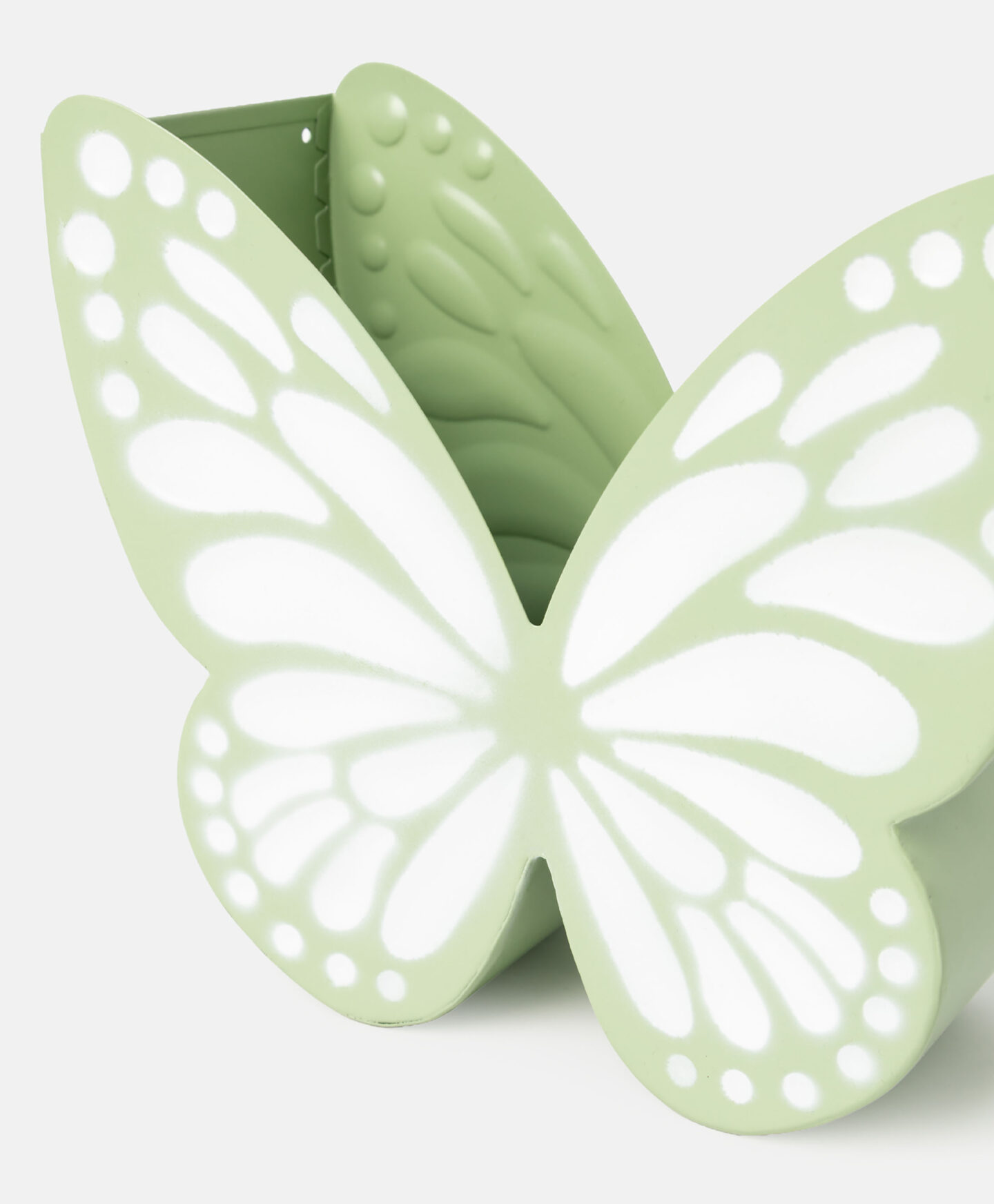 Der grüne Metall-Blumentopf mit Schmetterlingsmotiv ist eine frühlingshafte Wahl für Pflanzenliebhaber.