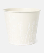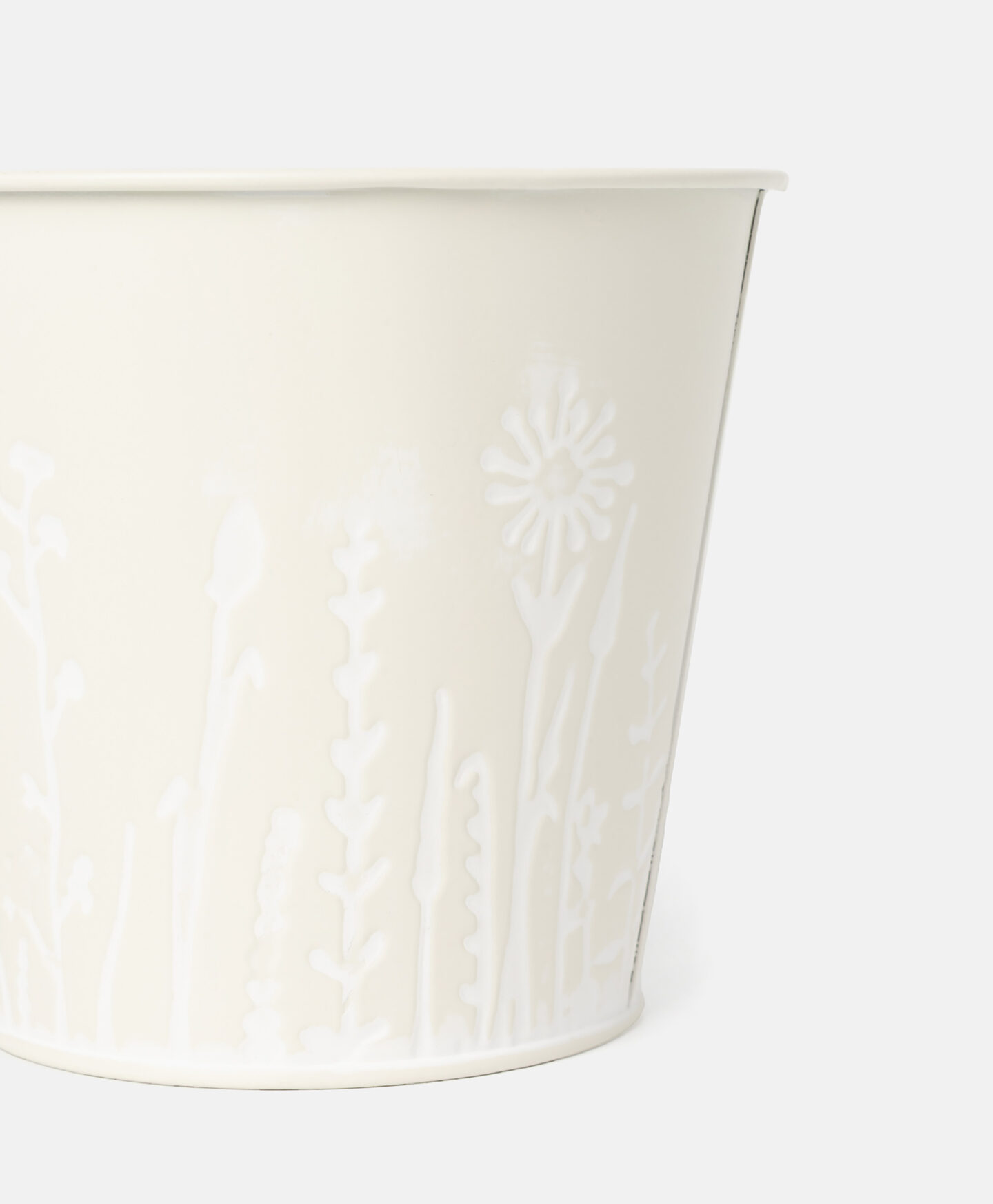 Der weiße Metall-Blumentopf mit Muster ist leicht, langlebig und wetterbeständig.
