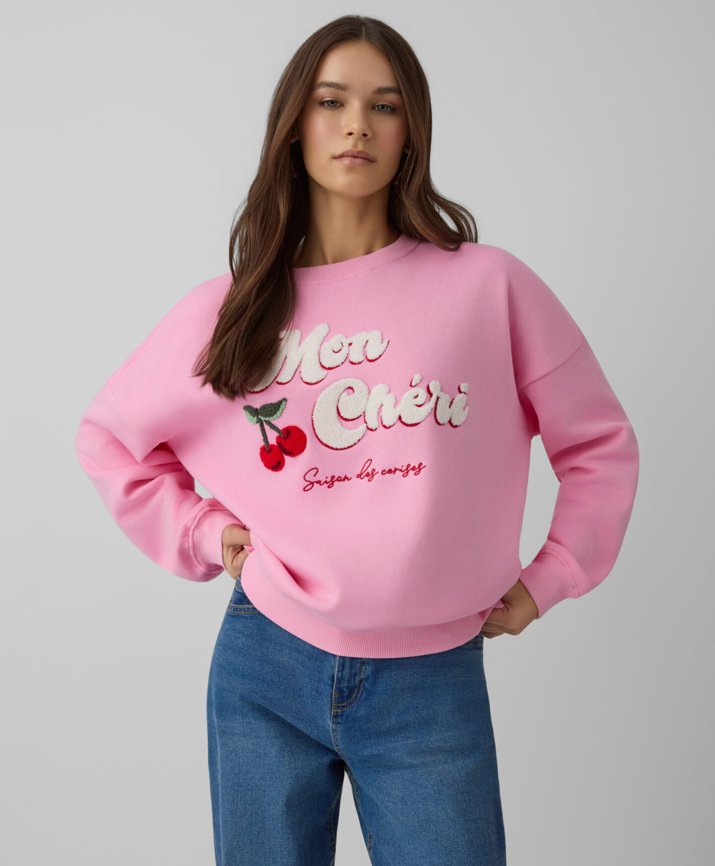 Das Damen-Sweatshirt mit Applikation besteht aus weichem Material mit Baumwollanteil.
