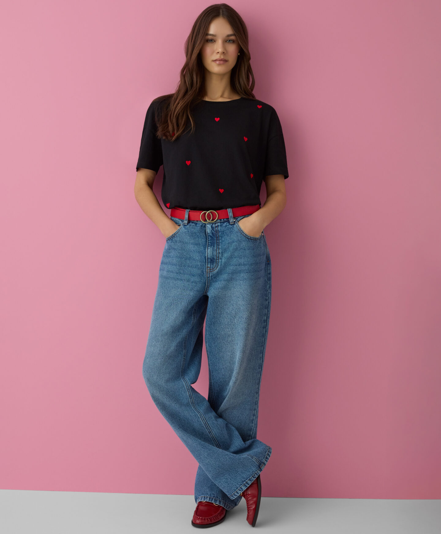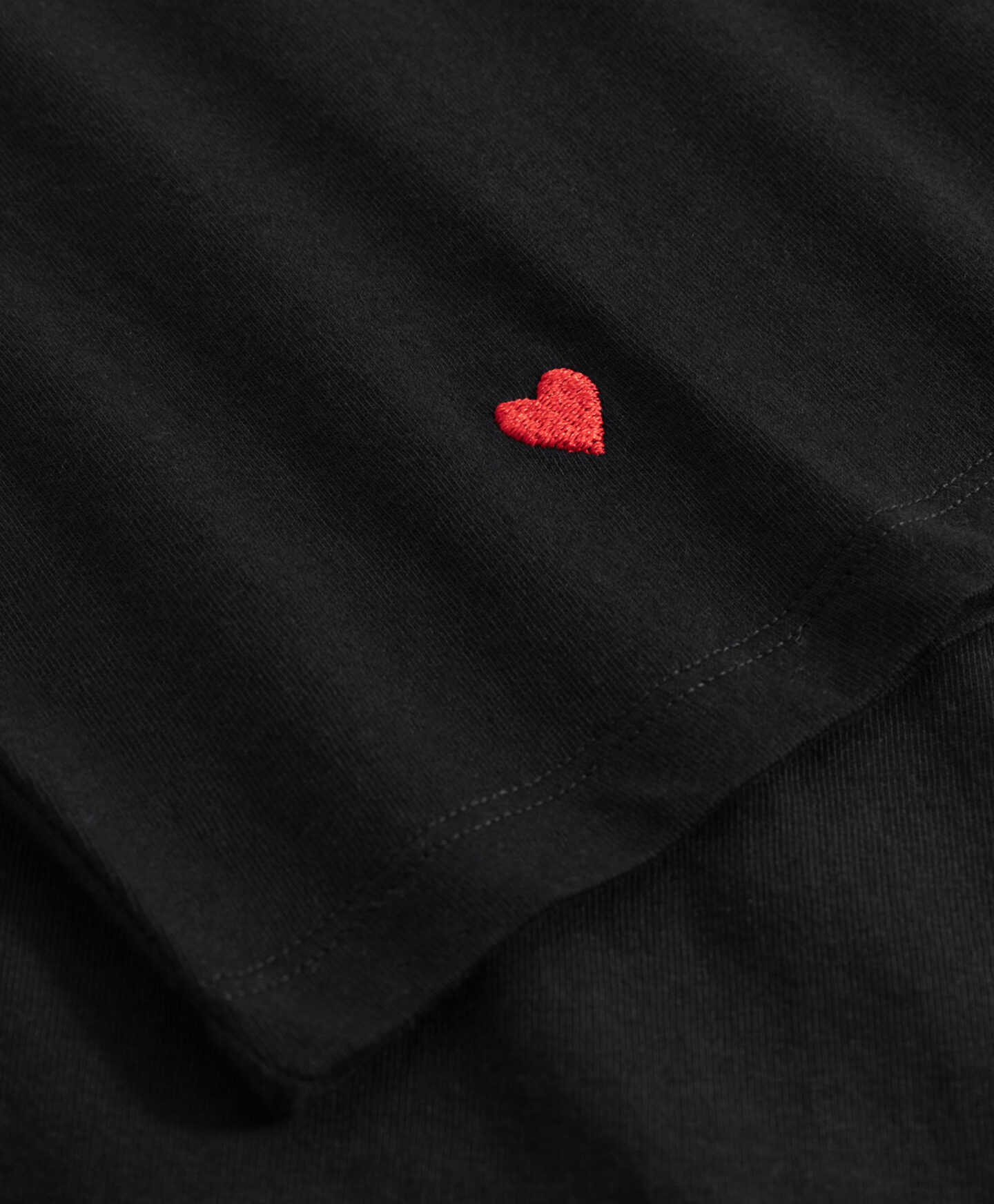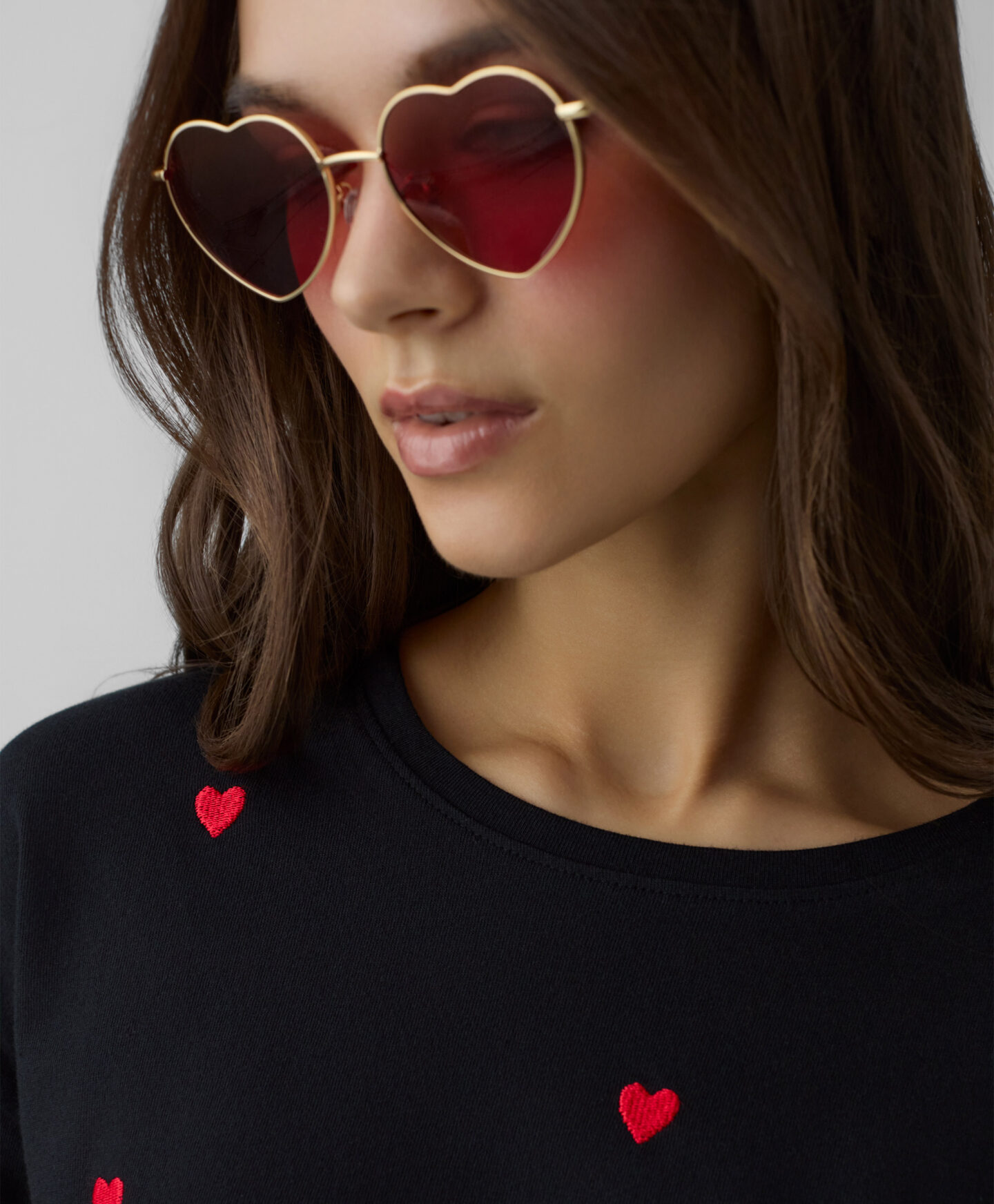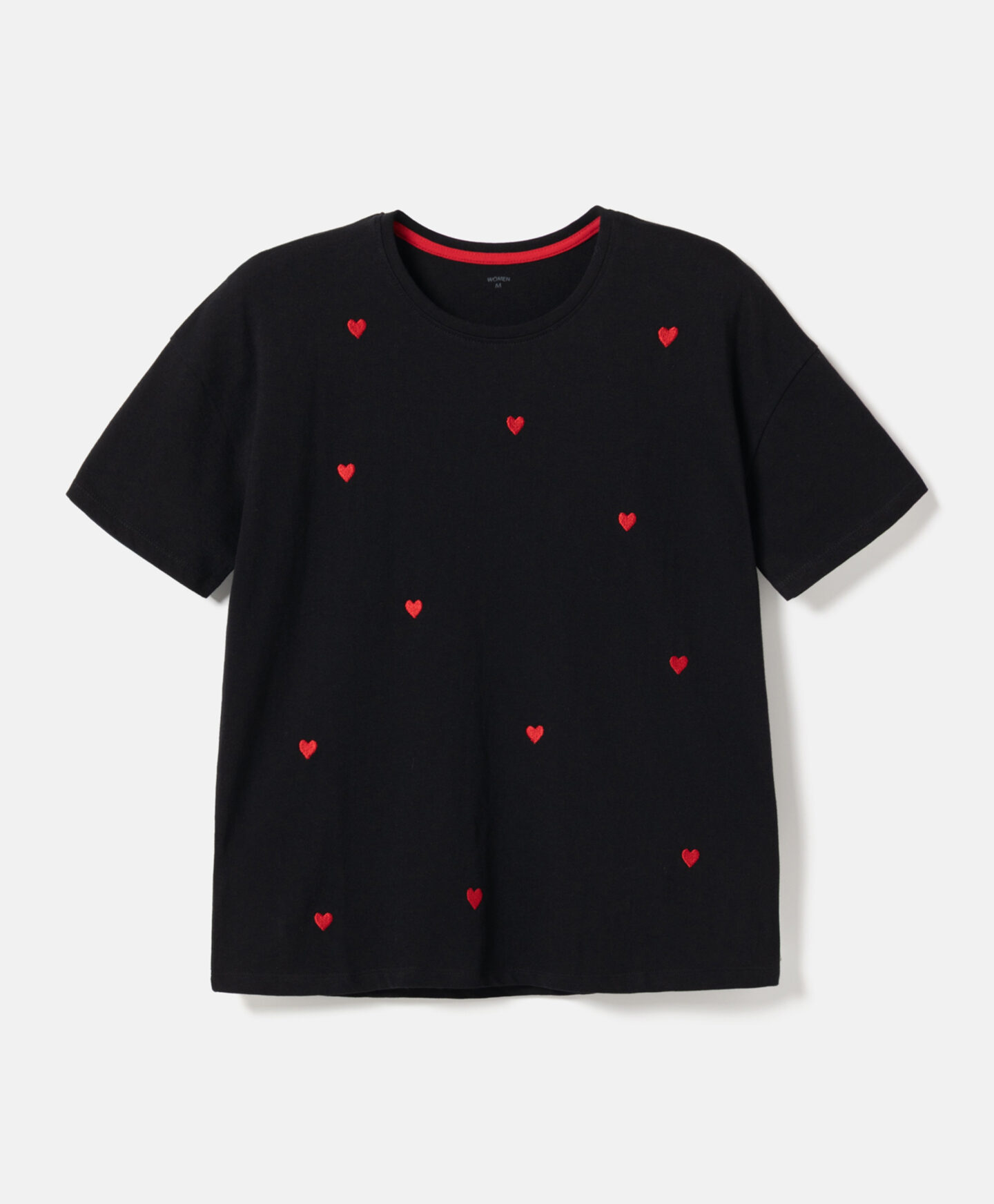 Das Damen-T-Shirt aus 100% Baumwolle mit Herzmotiv wurde für hohen Tragekomfort entworfen.