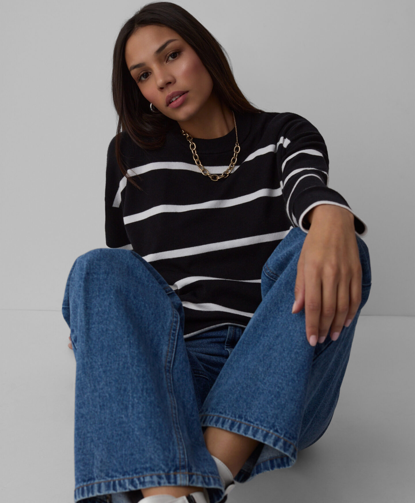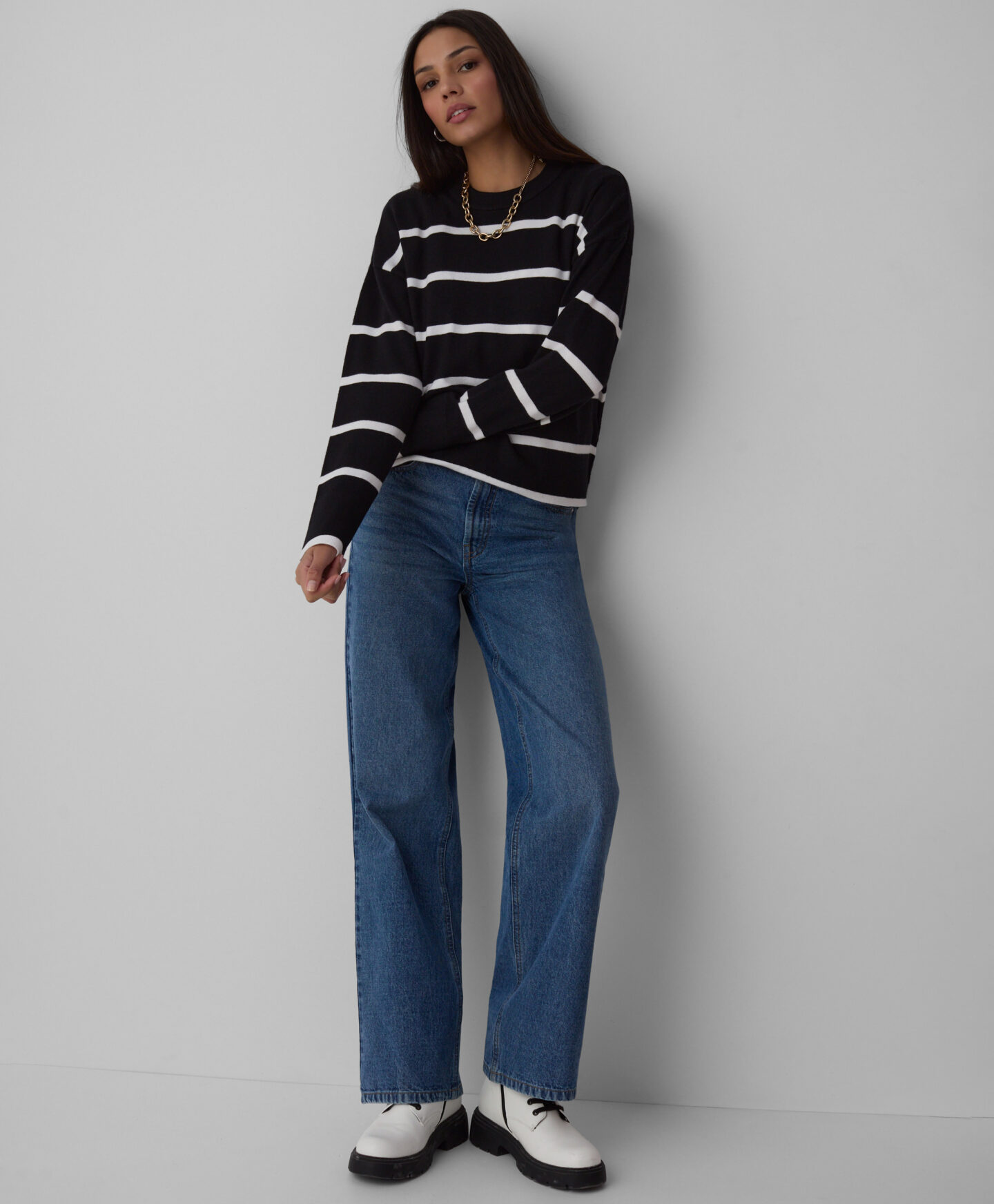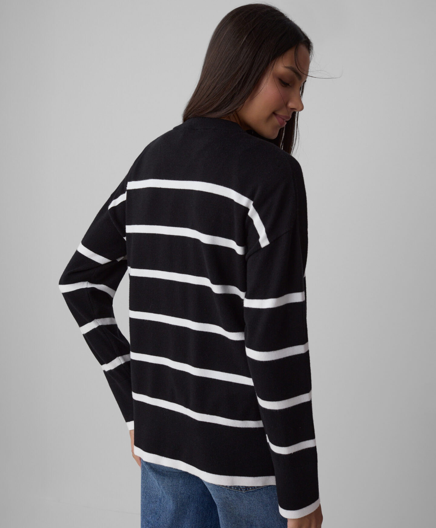 Der Damenpullover gestreift mit Viskose lässt sich hervorragend mit Jeans kombinieren.