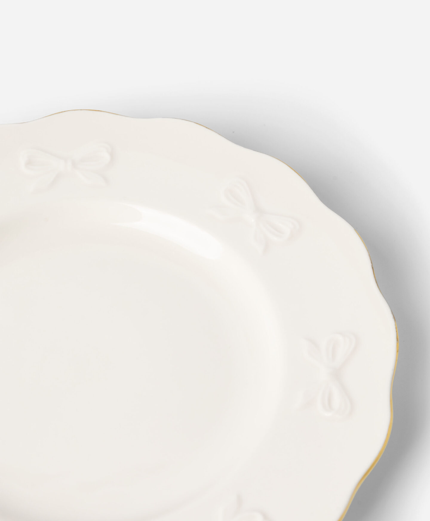 Der Dessertteller aus Keramik mit Schleifenmotiv ergänzt das Tischgeschirr auf elegante Weise.