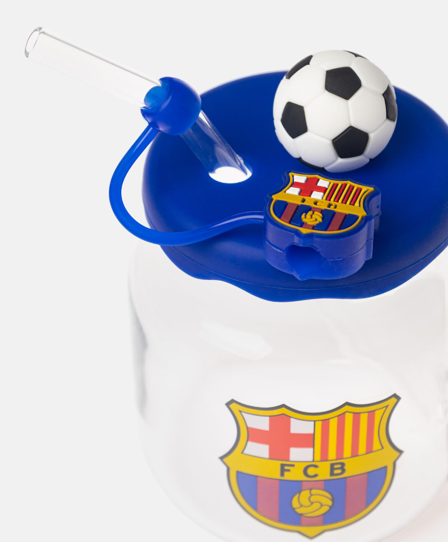 Der Glasbecher mit Lizenzmotiv von FC Barcelona, Deckel und Strohhalm ist vielseitig einsetzbar.