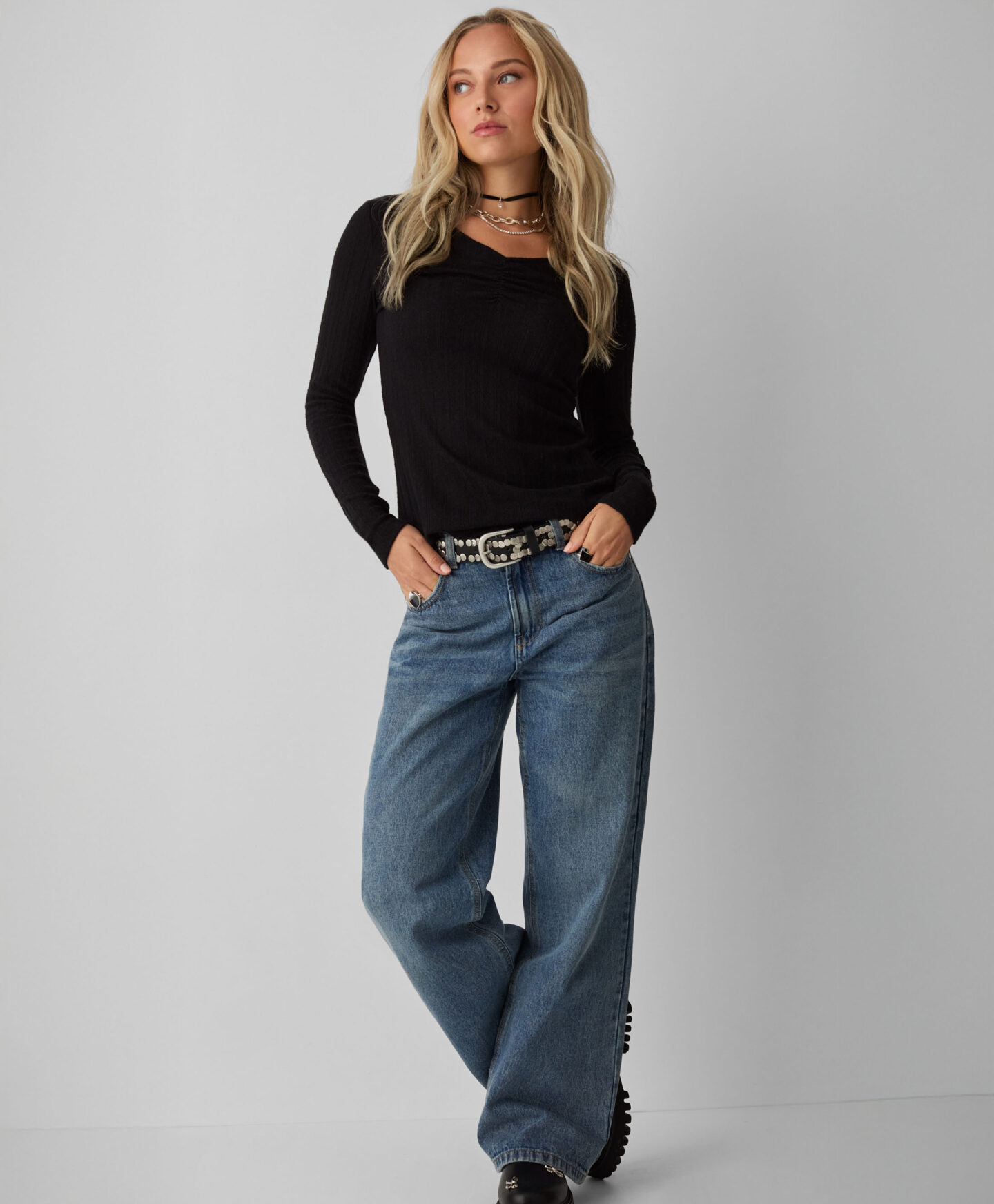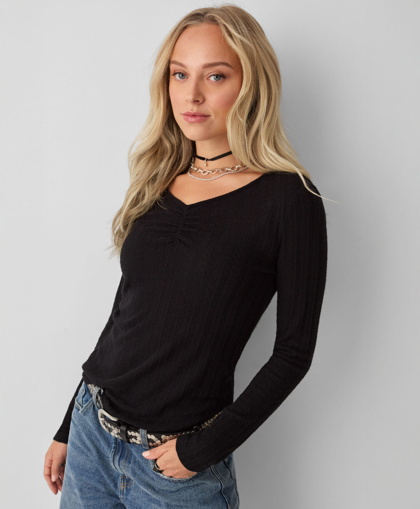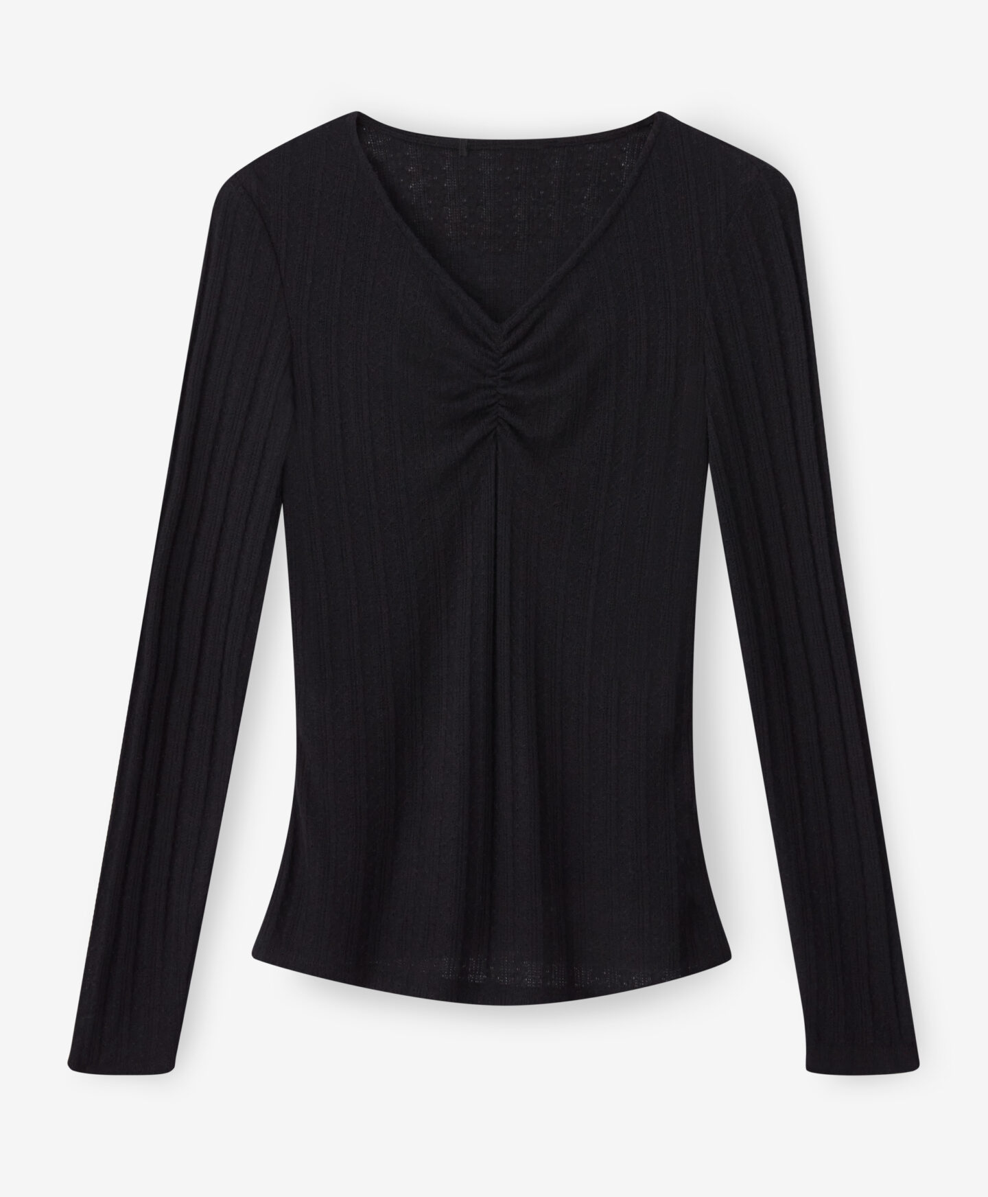 Gerafftes T-Shirt für Damen mit langen Ärmeln – Für Liebhaberinnen klassischer Stile. Es eignet sich hervorragend unter einem lockereren Blazer oder Sweatshirt an kühlen Tagen und sorgt für eine zusätzliche Wärmeschicht. Die Raffung am Halsausschnitt ist ein femininer Akzent, der die Vorzüge der Silhouette betont. Die schwarze Farbe macht das Oberteil vielseitig kombinierbar.