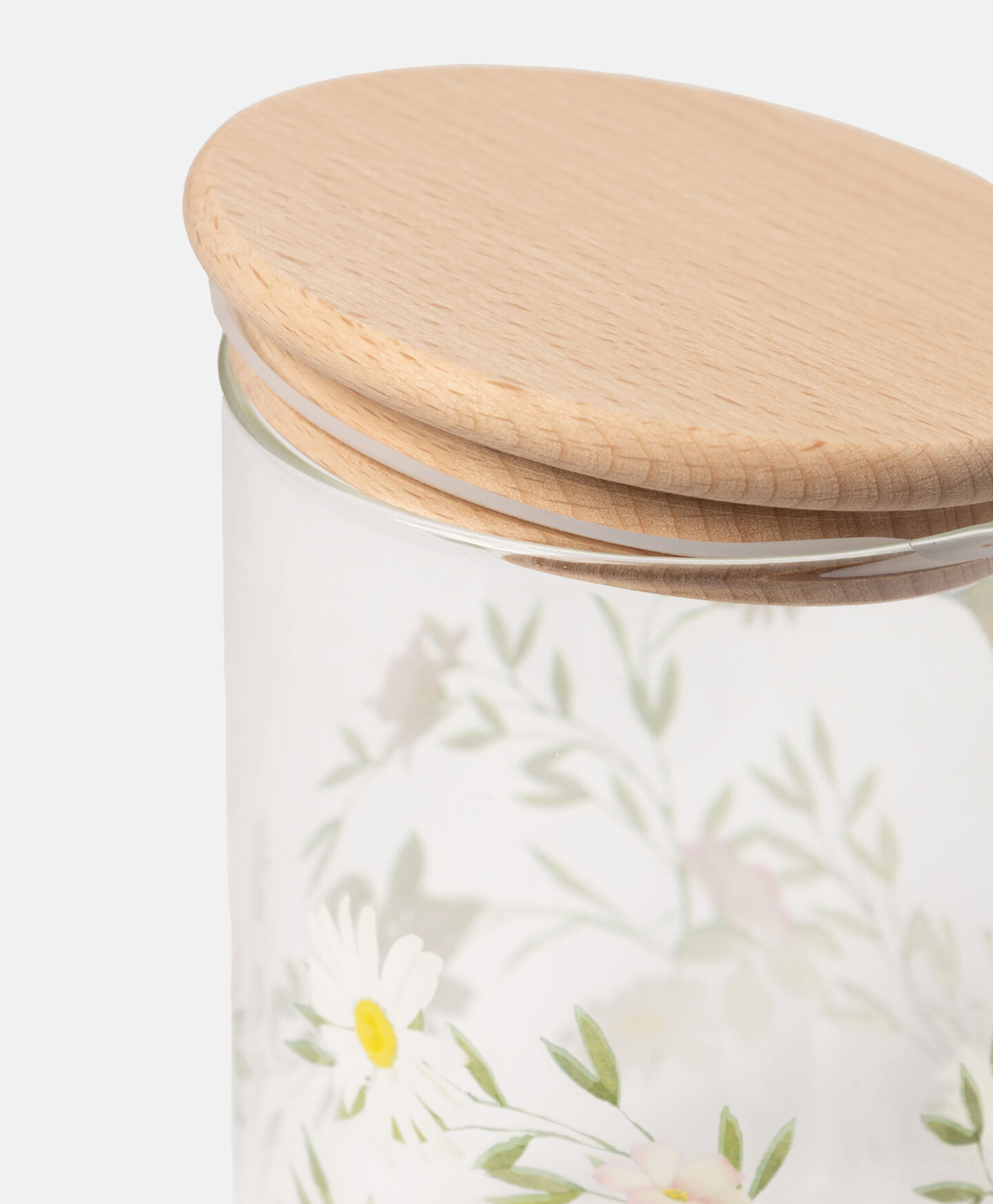 Der kleine Glasbehälter mit Buchenholzdeckel ist eine dekorative und praktische Lösung für die Küche.