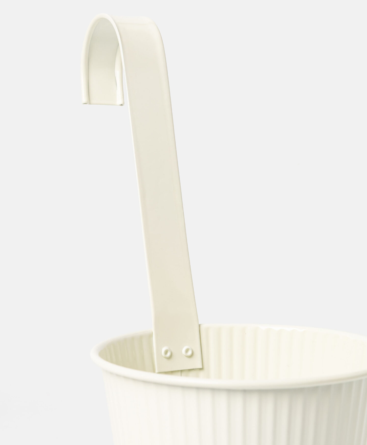 Die weiße hängende Pflanzkübel-Abdeckung mit gerippter Oberfläche fällt durch ihr frühlingshaftes Design auf.