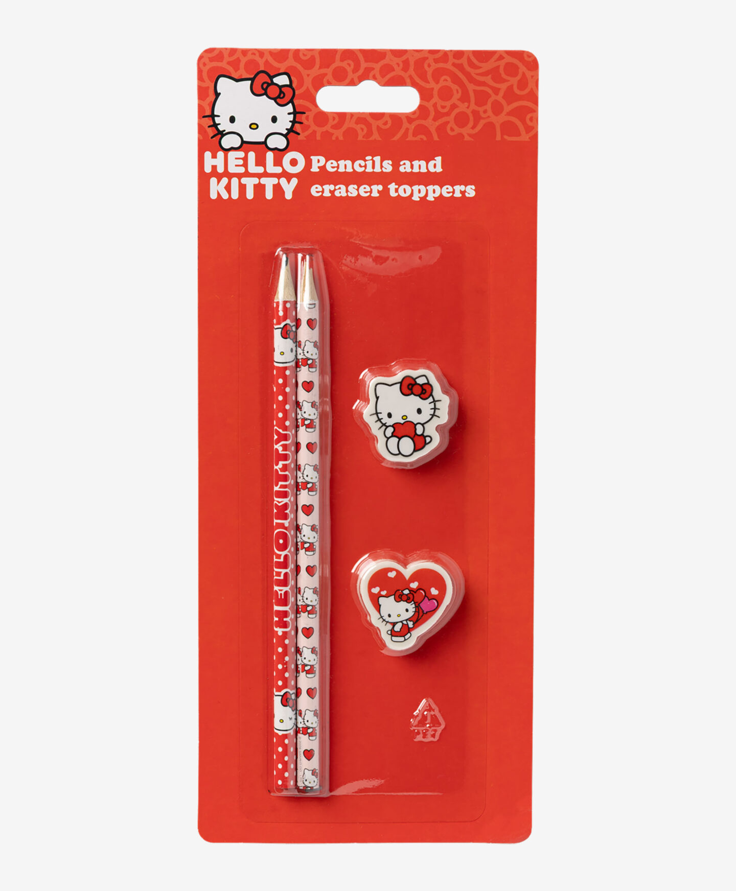Das Hello-Kitty-Schulset enthält zwei Bleistifte und Radiergummis mit dem bekannten Motiv.