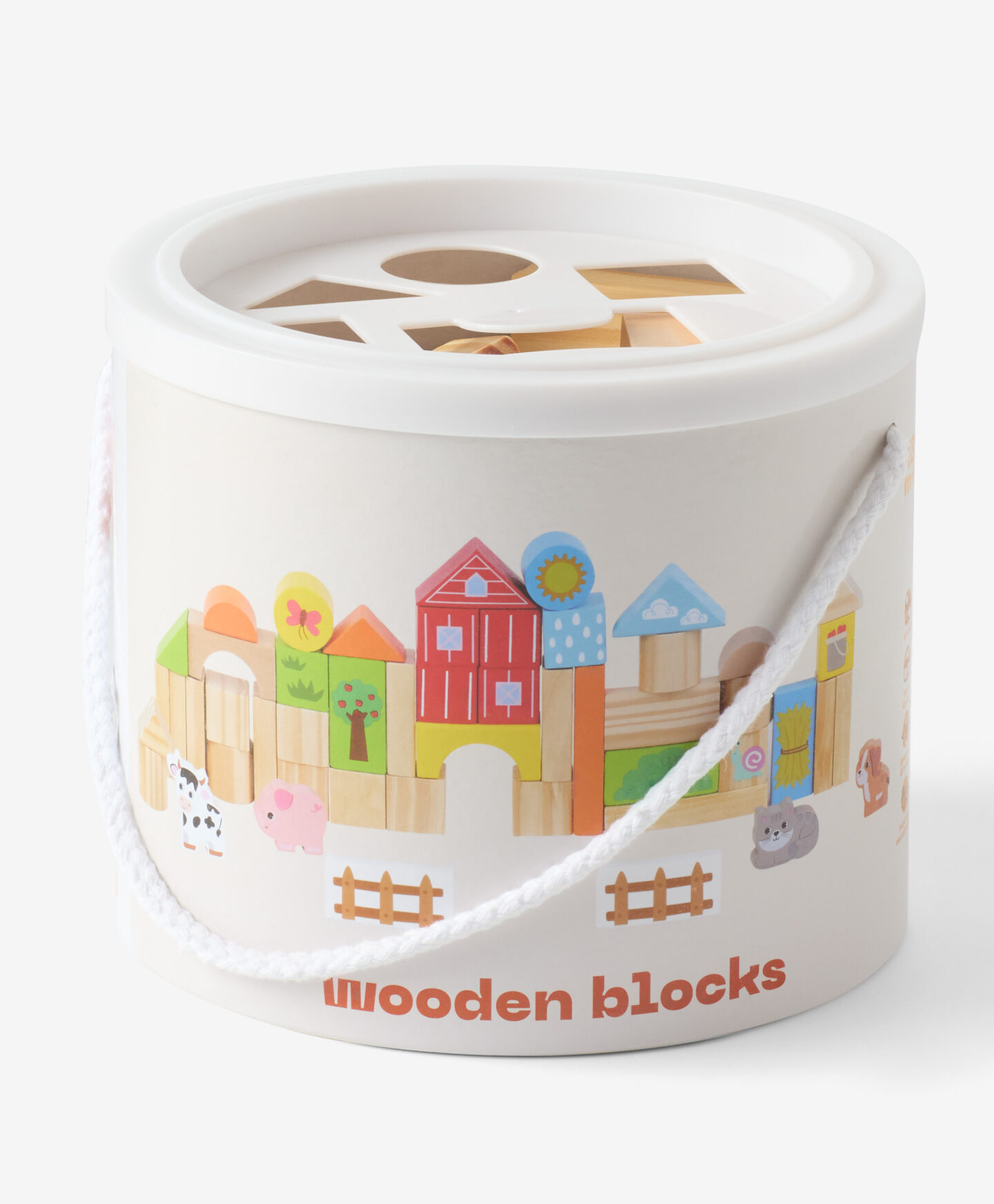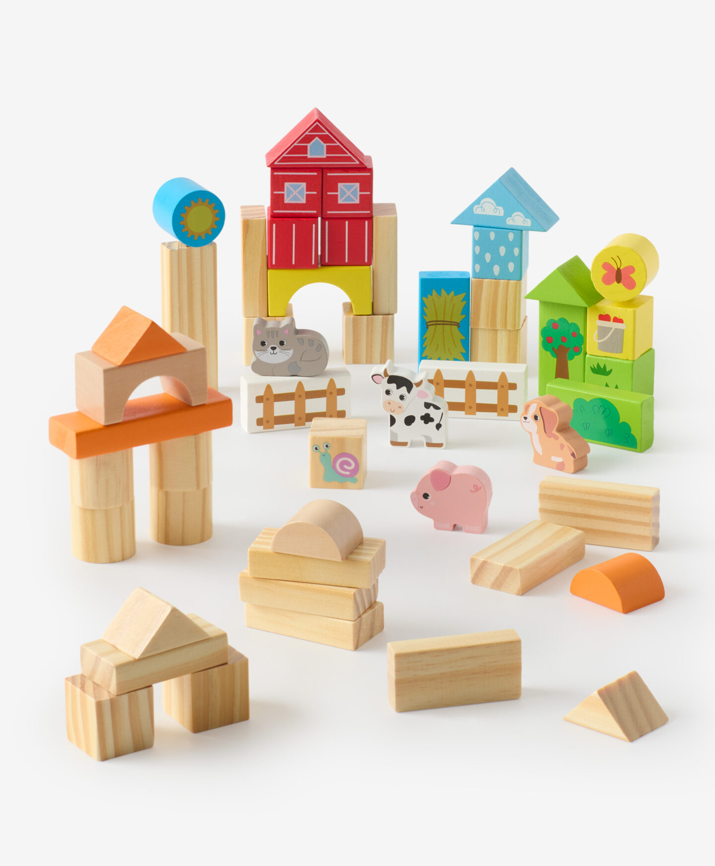 Die Holzbausteine mit 50 Teilen ermöglichen den Bau von Türmen, Häusern und ganzen Städten.