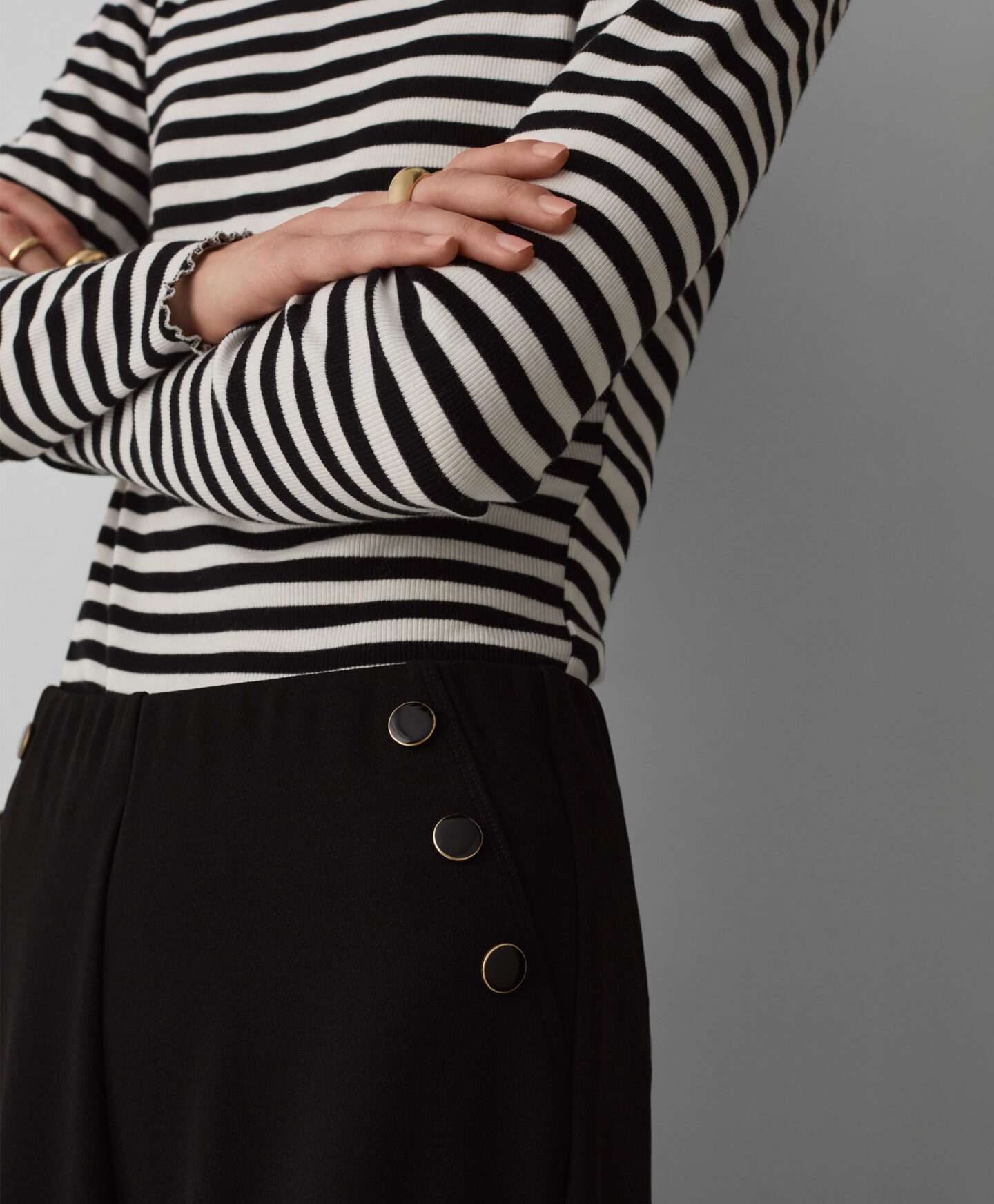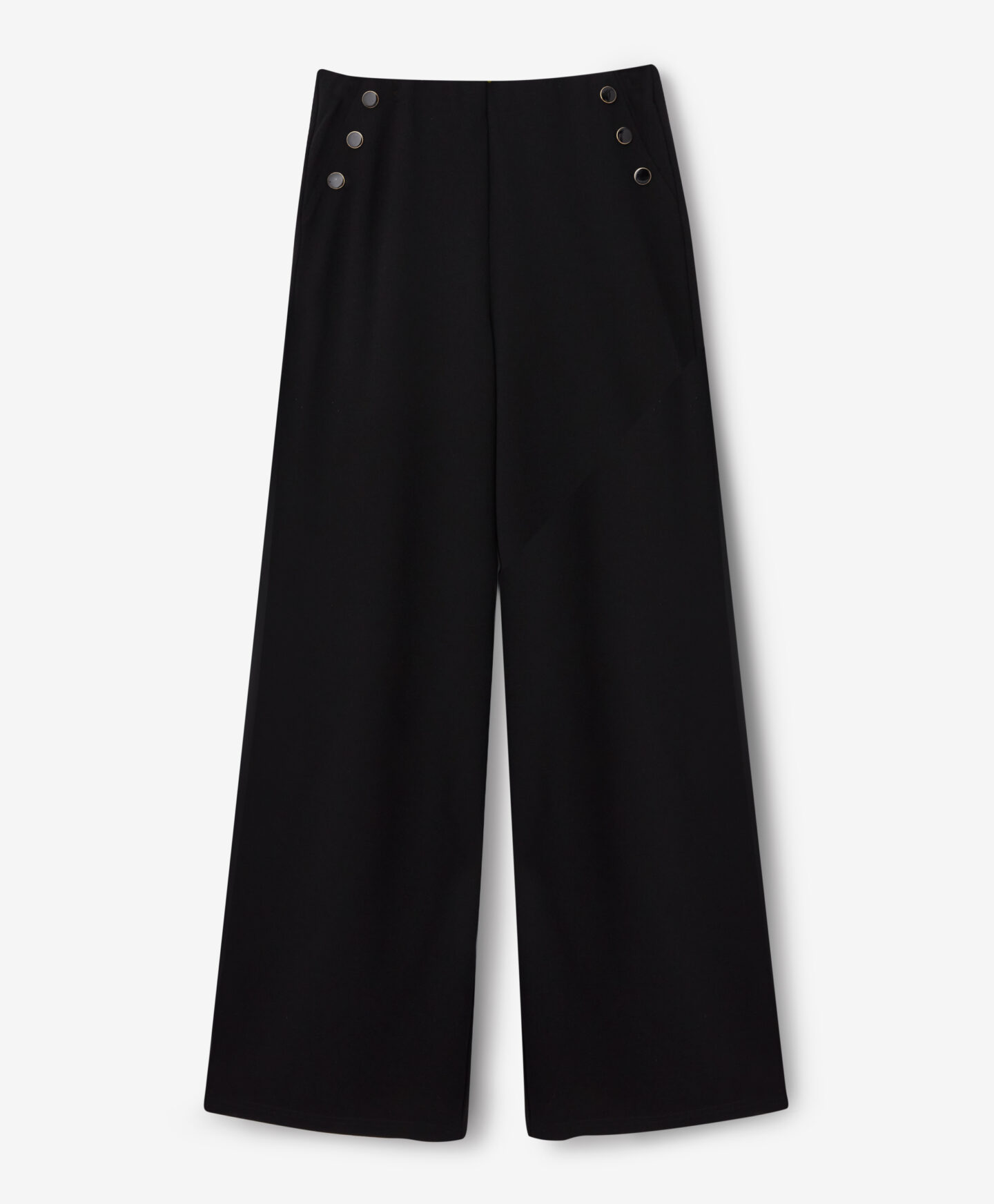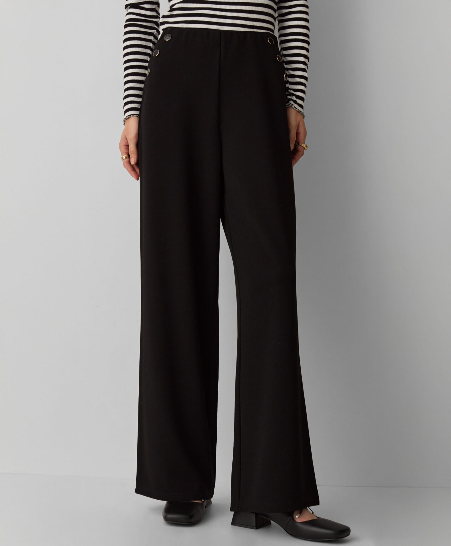 Women’s pants with buttons and wide legs will allow you to make a statement at the office and at more formal gatherings. They are comfortable, lightweight, and pleasant to wear. Decorative buttons draw attention, being a fashionable accent to any outfit. Wide legs offer freedom of movement.