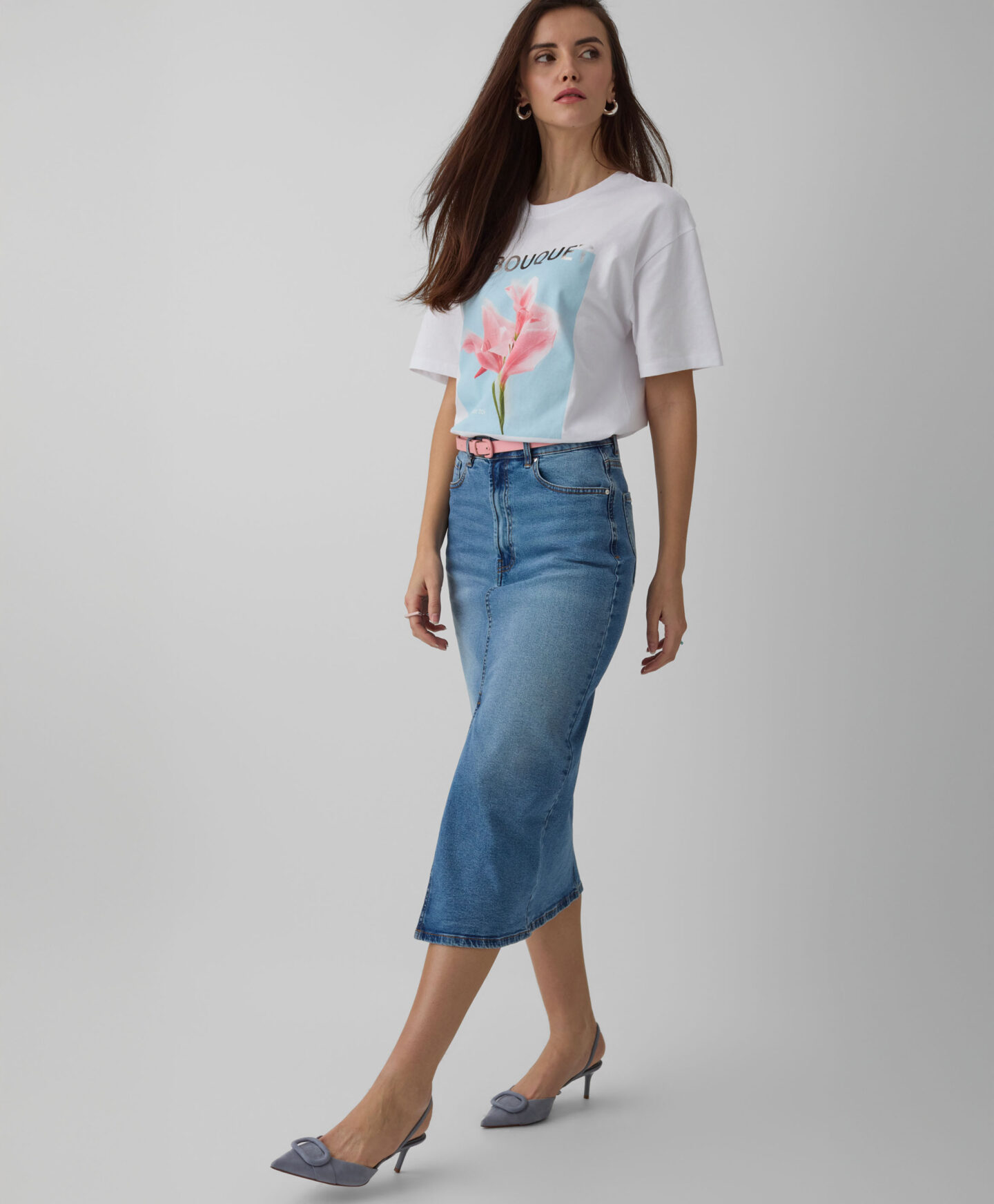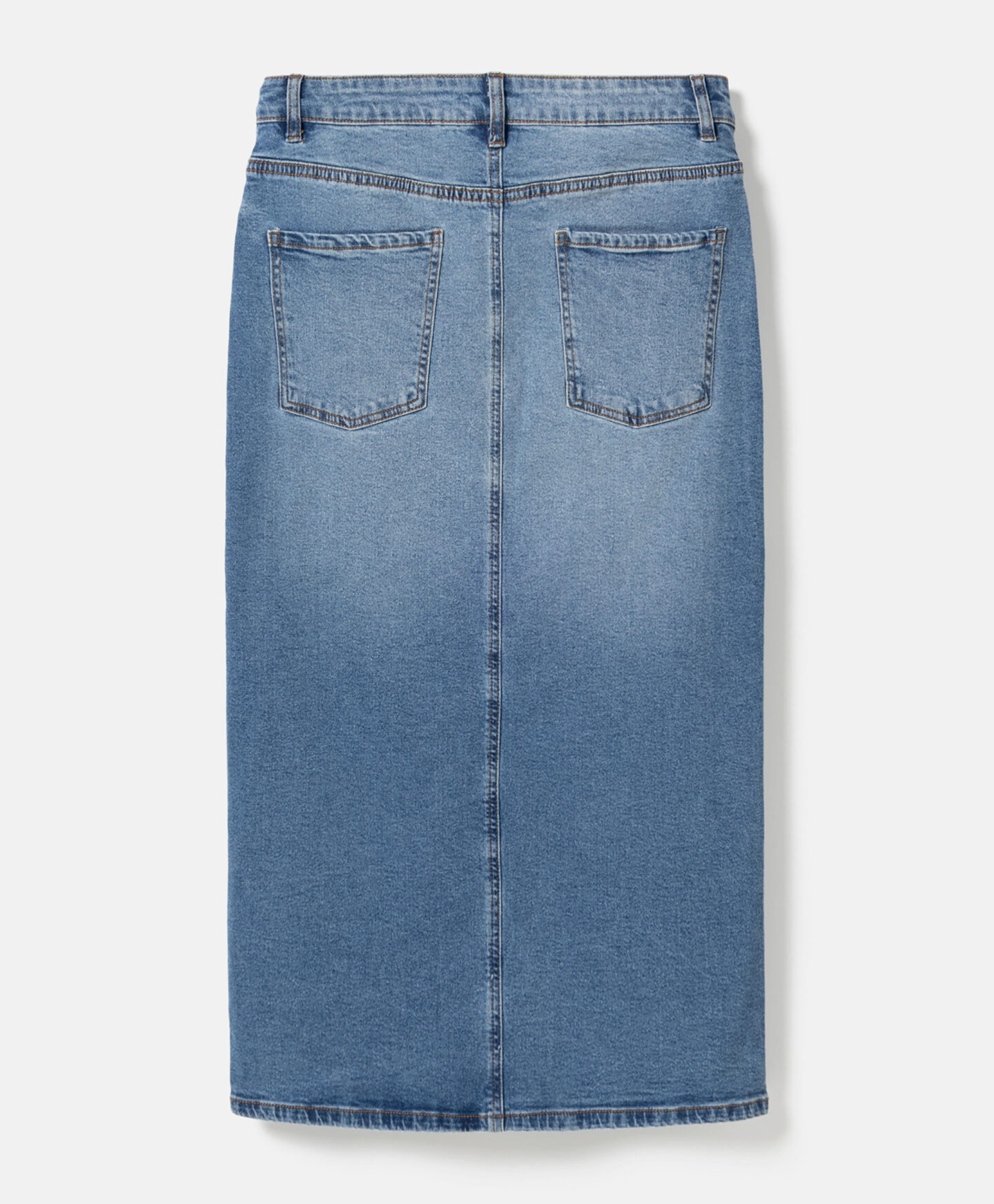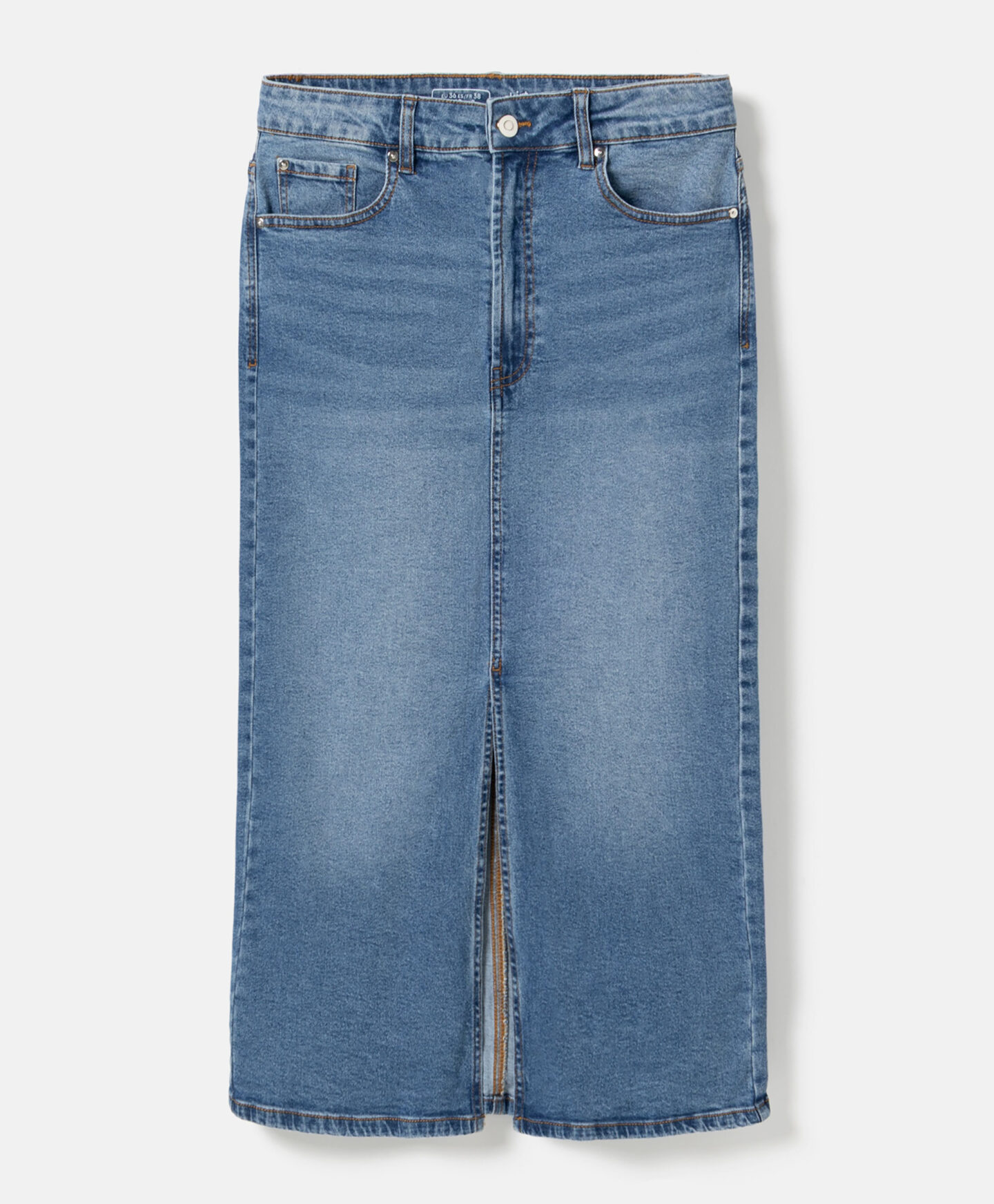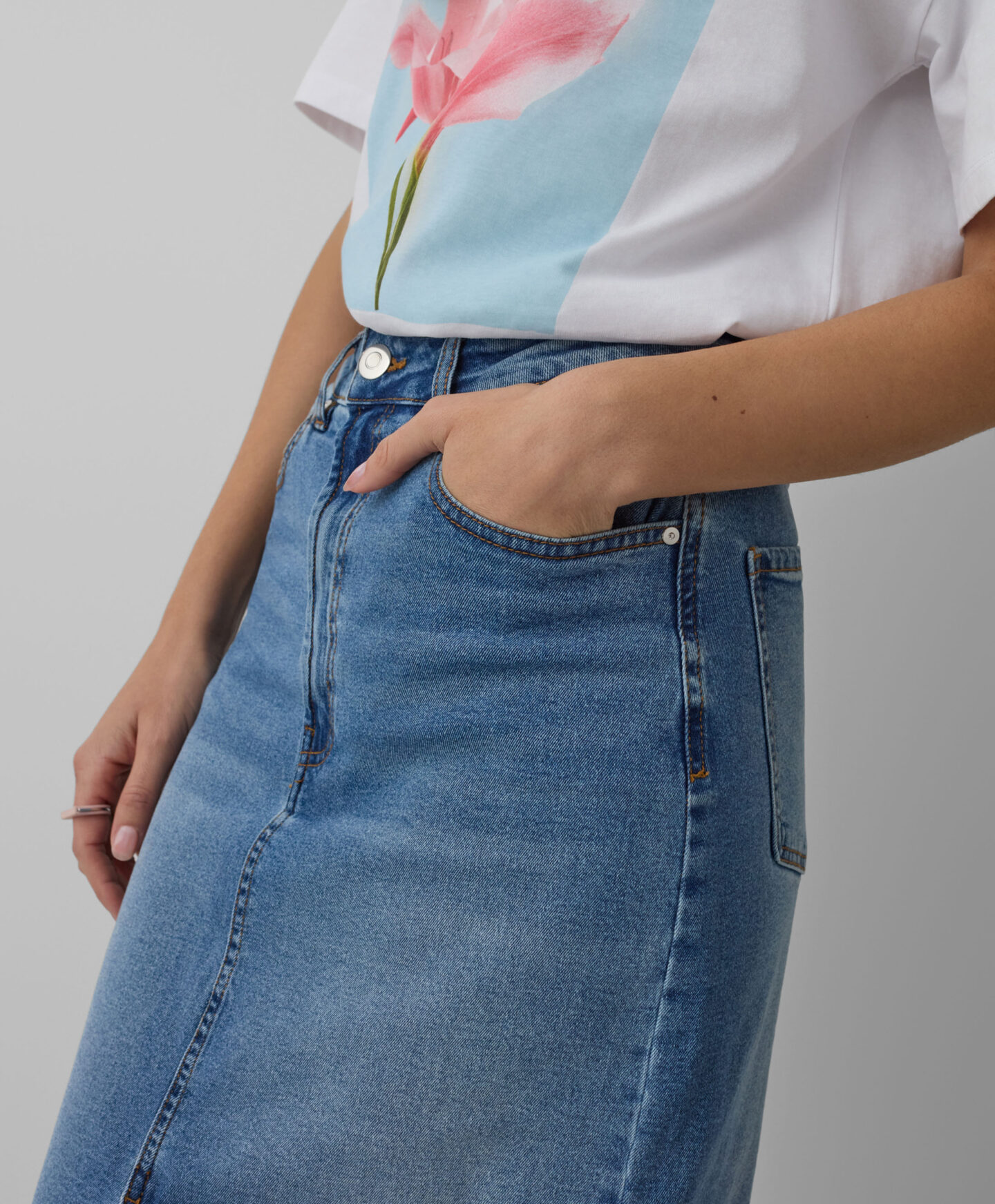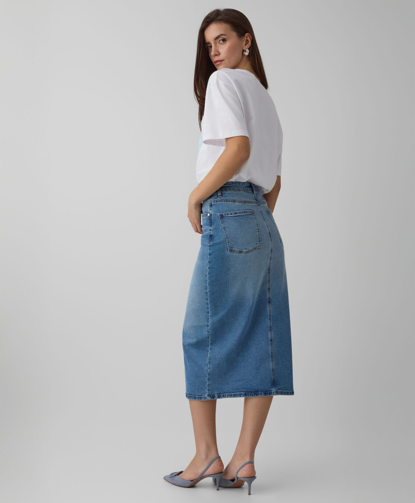 Ein Jeansrock mit Schlitz vorne betont die Figur auf stilvolle Weise.