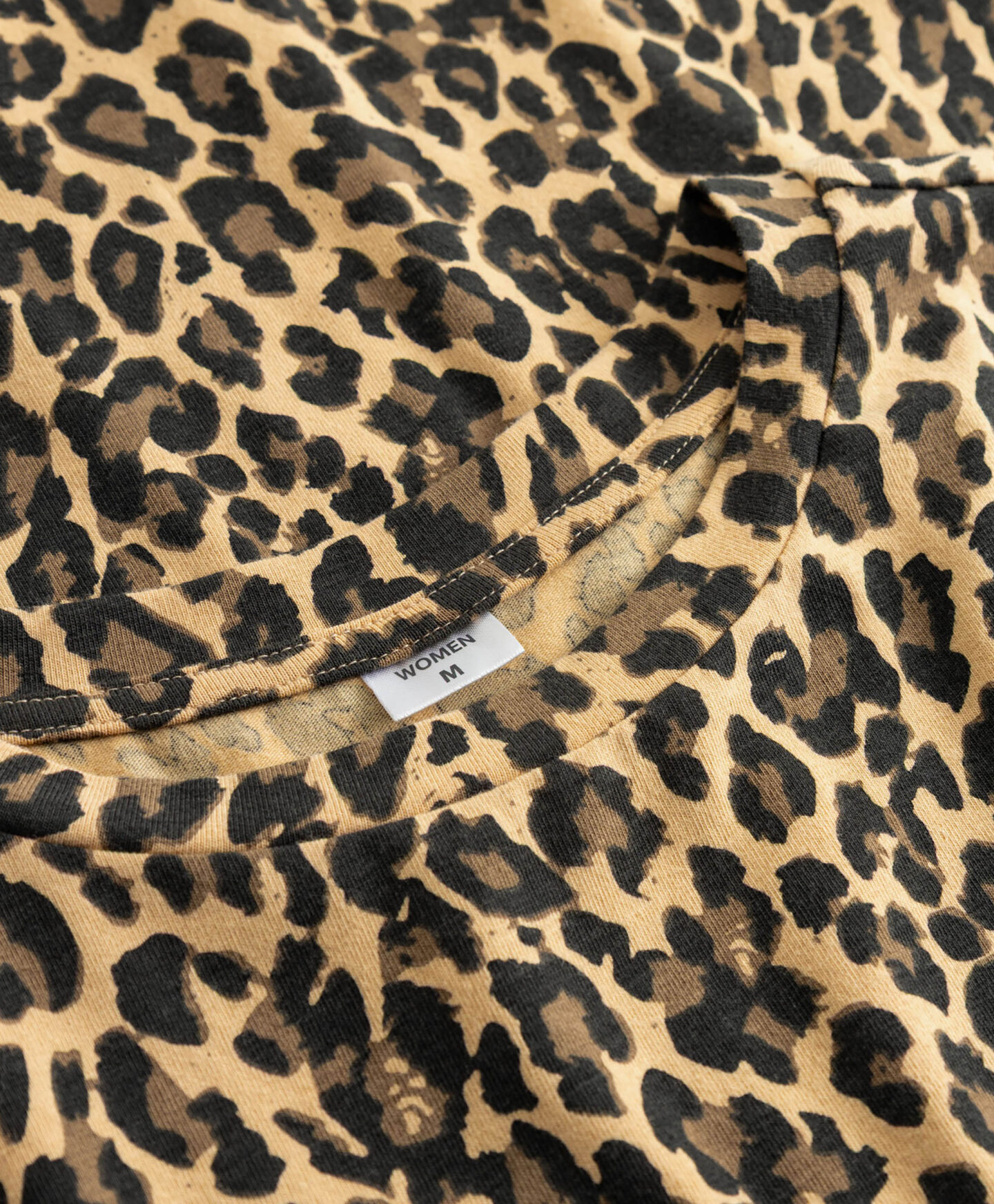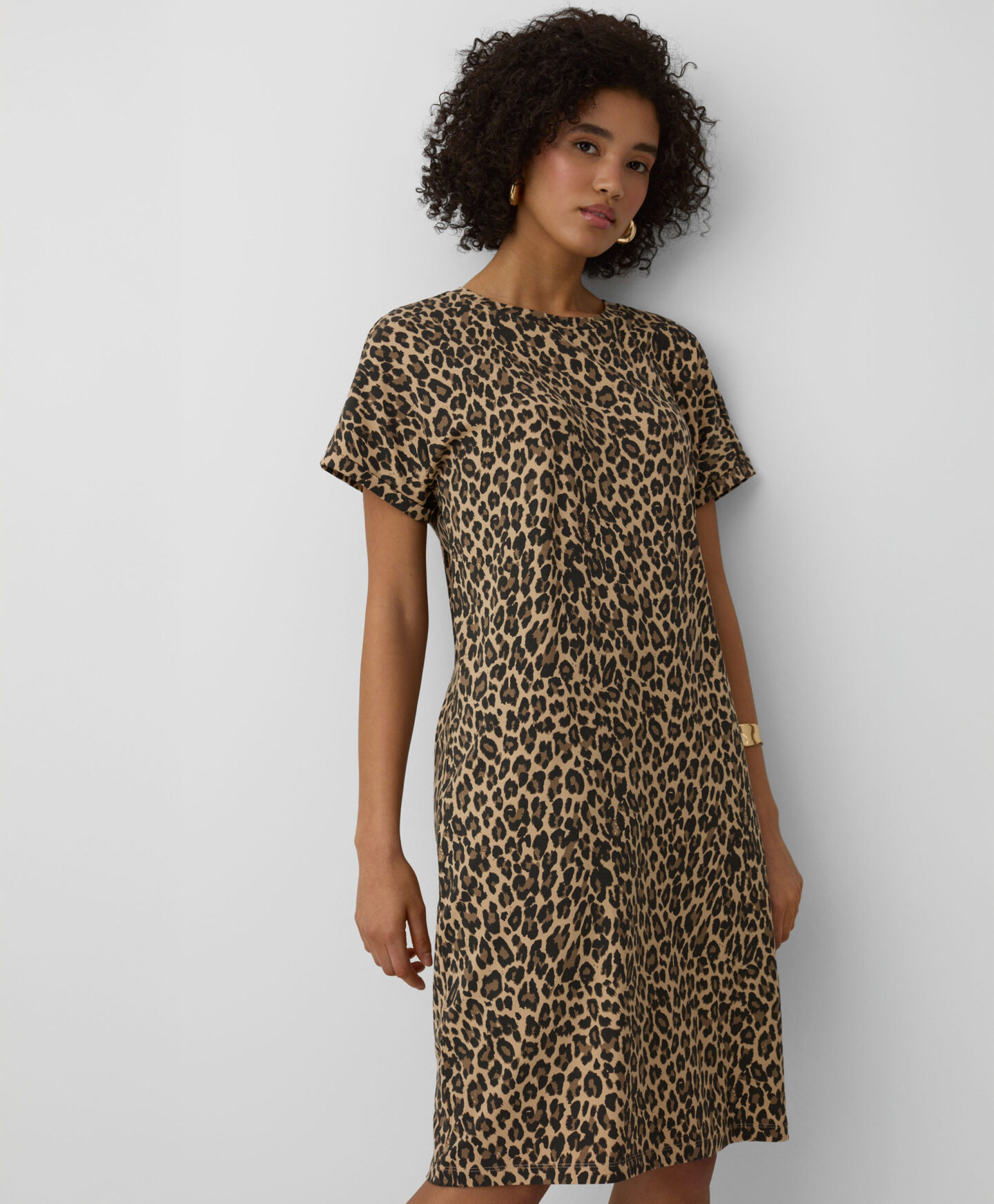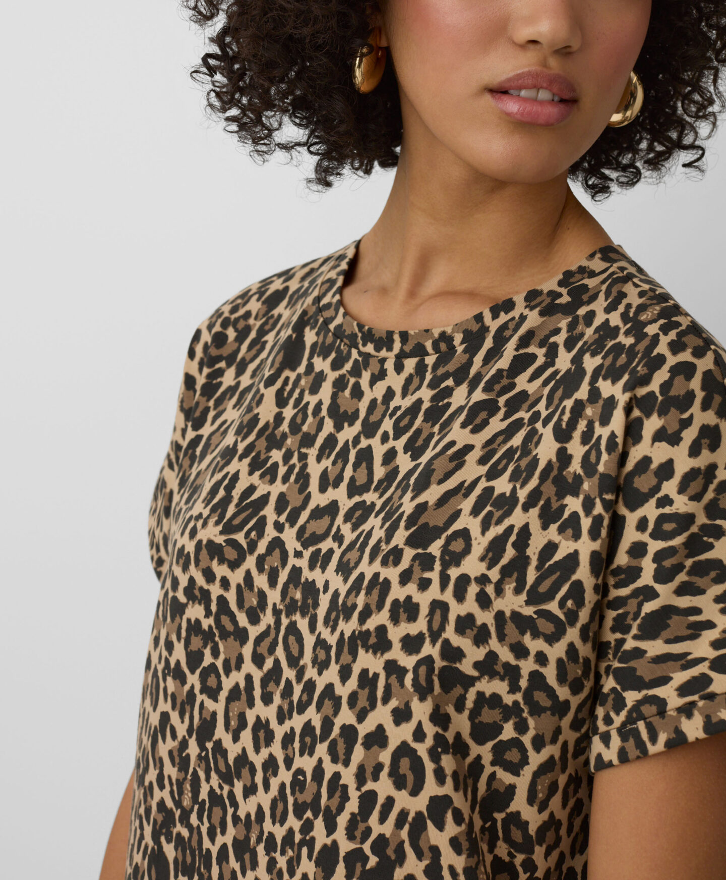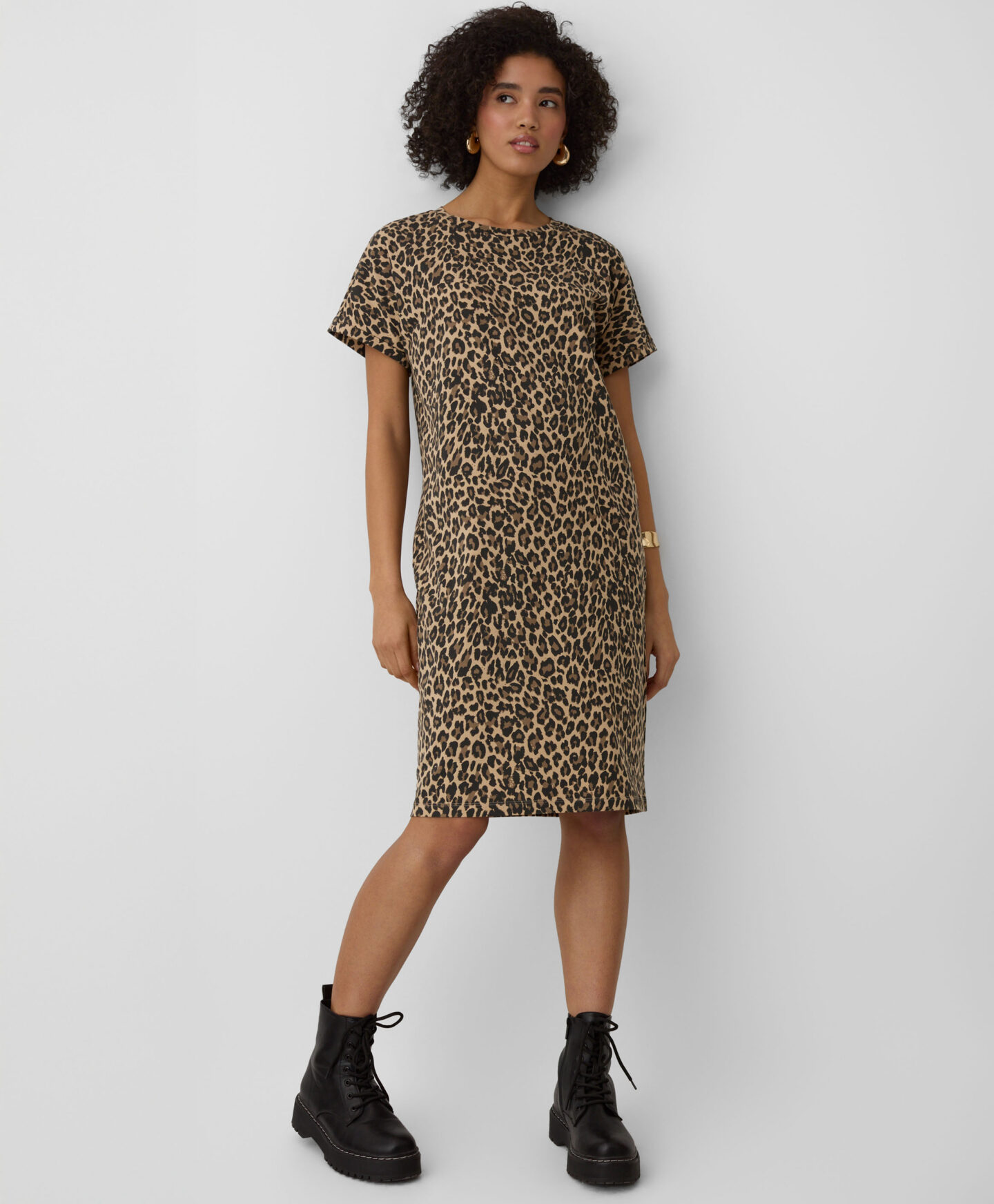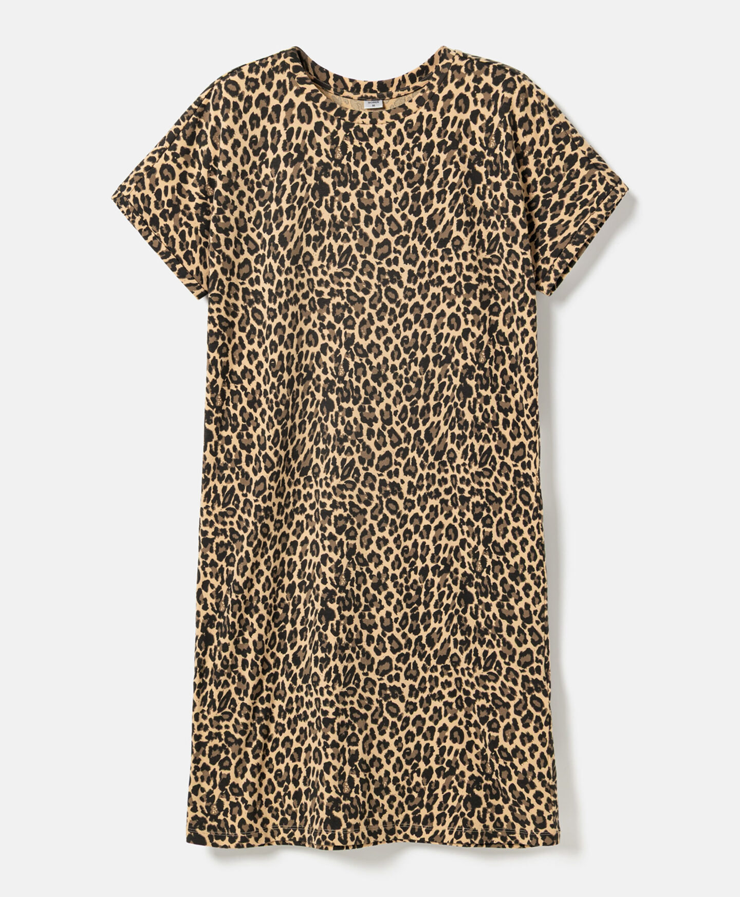 Das Kleid mit Leopardenmuster sorgt für einen auffälligen Look.