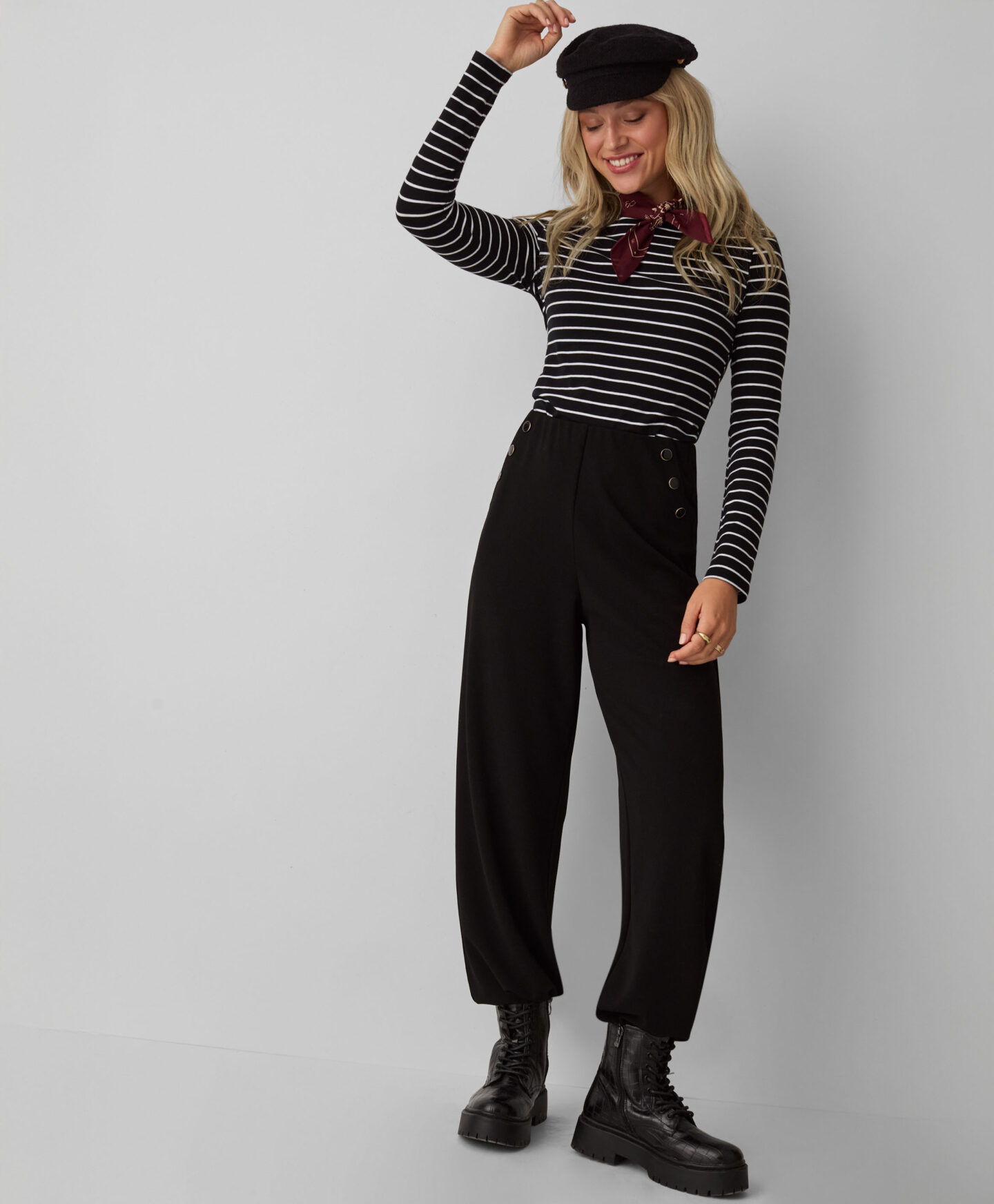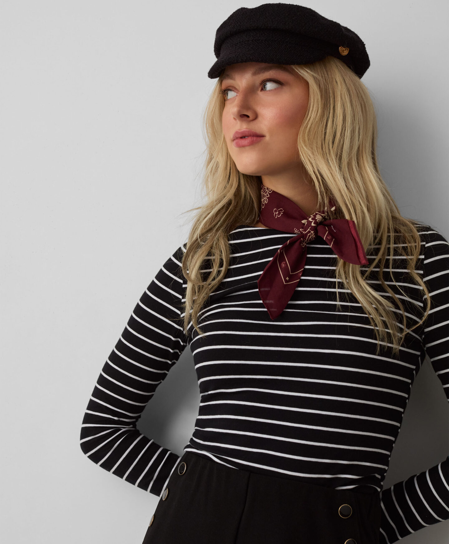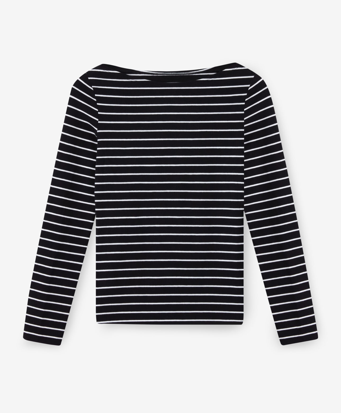 Schwarzes gestreiftes T-Shirt für Damen mit langen Ärmeln – Sieht besonders gut zu klassischen Jeans aus. Es ist leicht, weich im Griff und atmungsaktiv. Eine ausgezeichnete Wahl sowohl für die Arbeit als auch zum Entspannen zu Hause. In der Kollektion findest du weitere Farbvariants der gestreiften Tops.