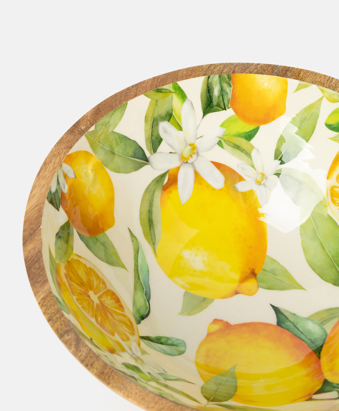 Die Servierschale aus Mangoholz mit Zitronenmuster überzeugt durch ihr frisches Design.