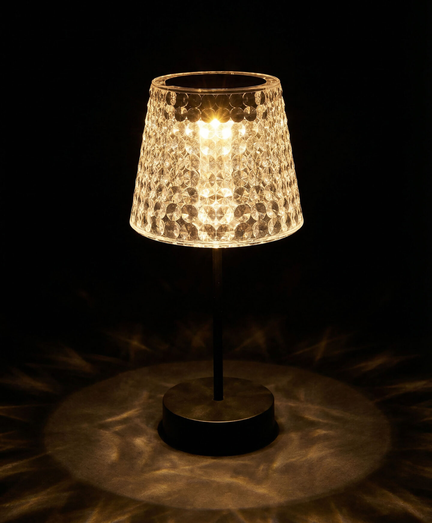 Die Solar-Tischlampe mit Kristallschirm zieht alle Blicke auf sich.
