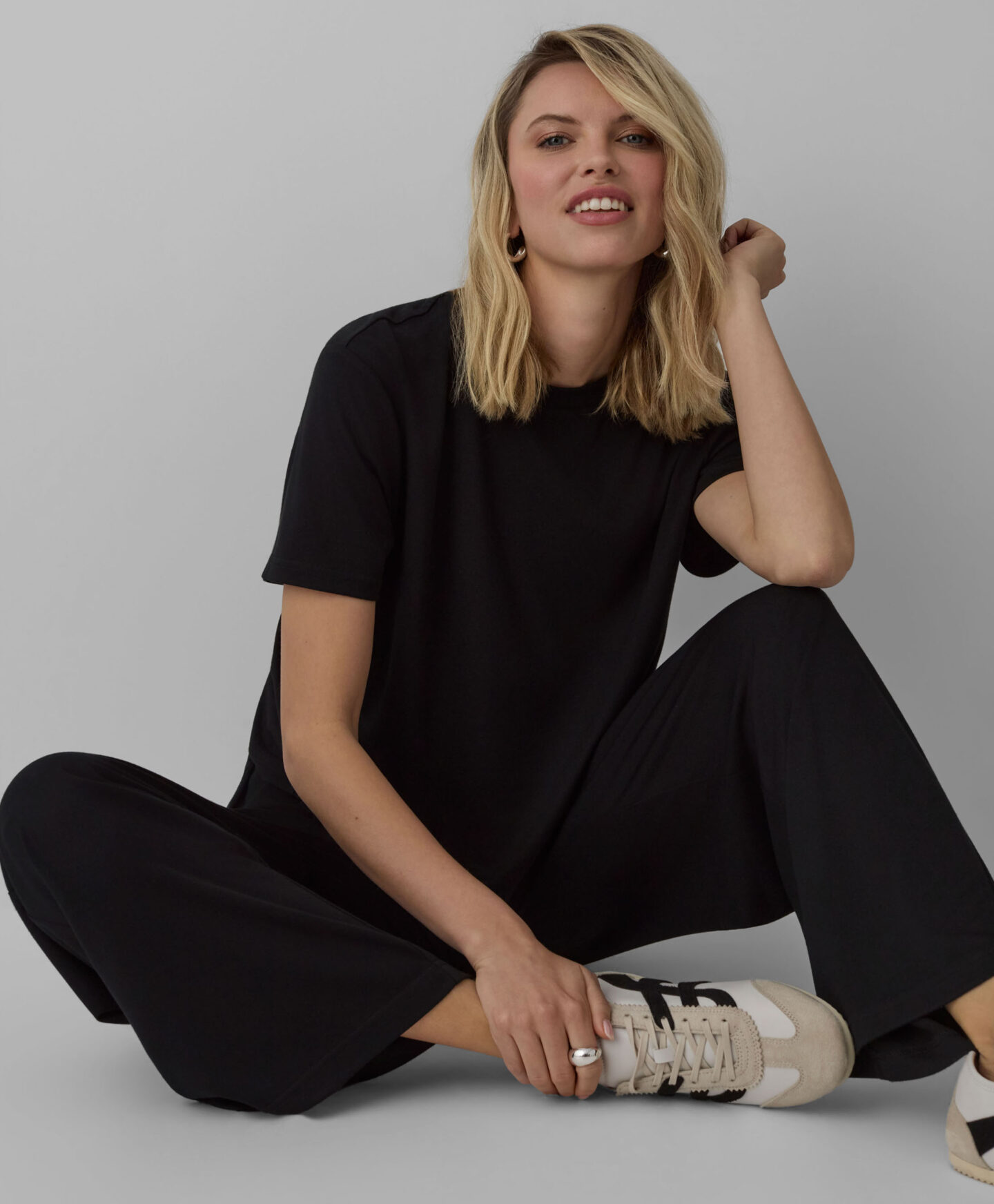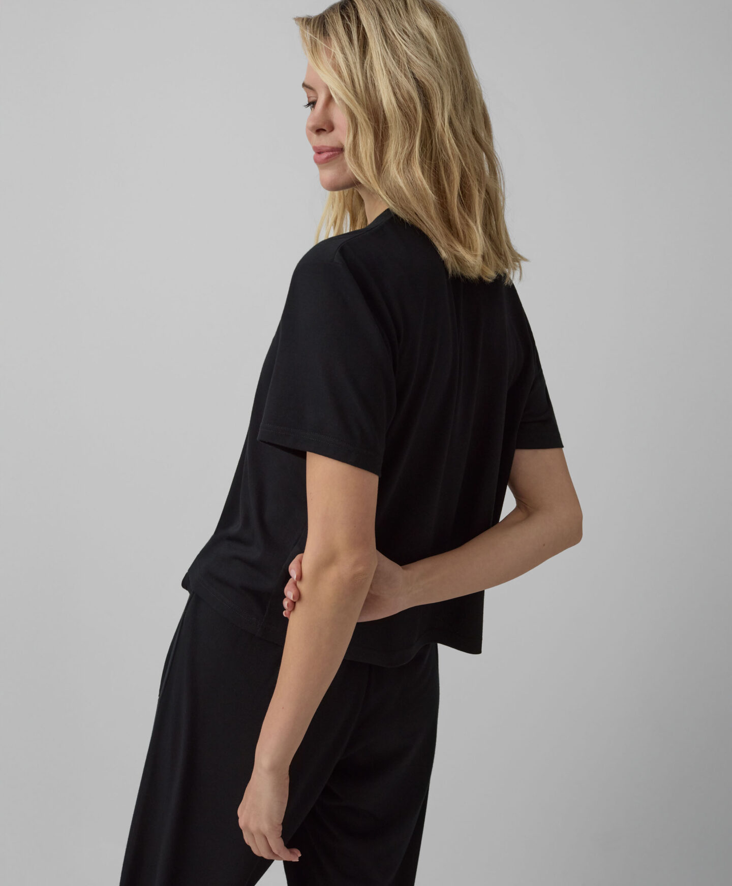 Ein T-Shirt mit kurzen Ärmeln lässt sich ideal mit einer Hose mit Bindeband kombinieren.