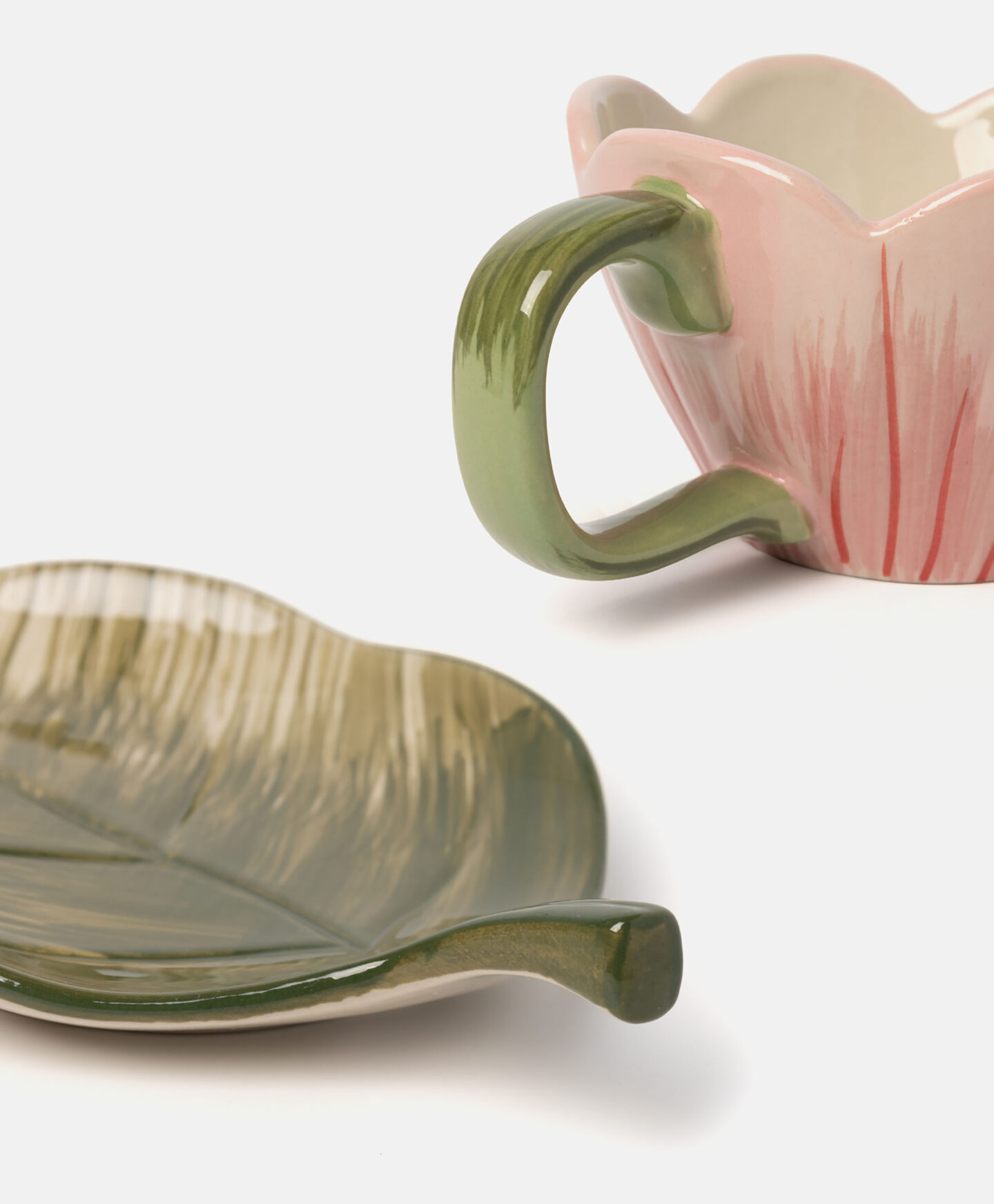 Die Tasse mit Blumenmotiv und blattförmiger Untertasse besticht durch ihre detailreiche Gestaltung.