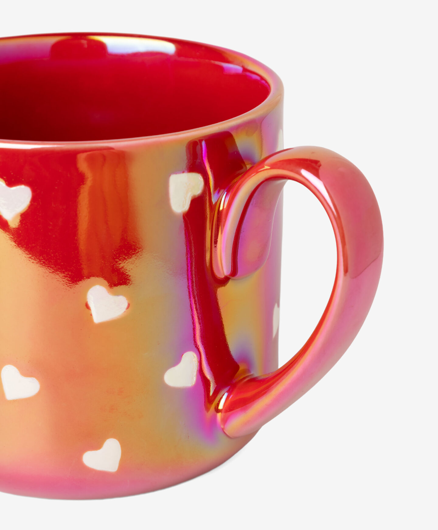 Die Tasse mit Herzmuster und Holo-Effekt setzt dekorative Akzente.