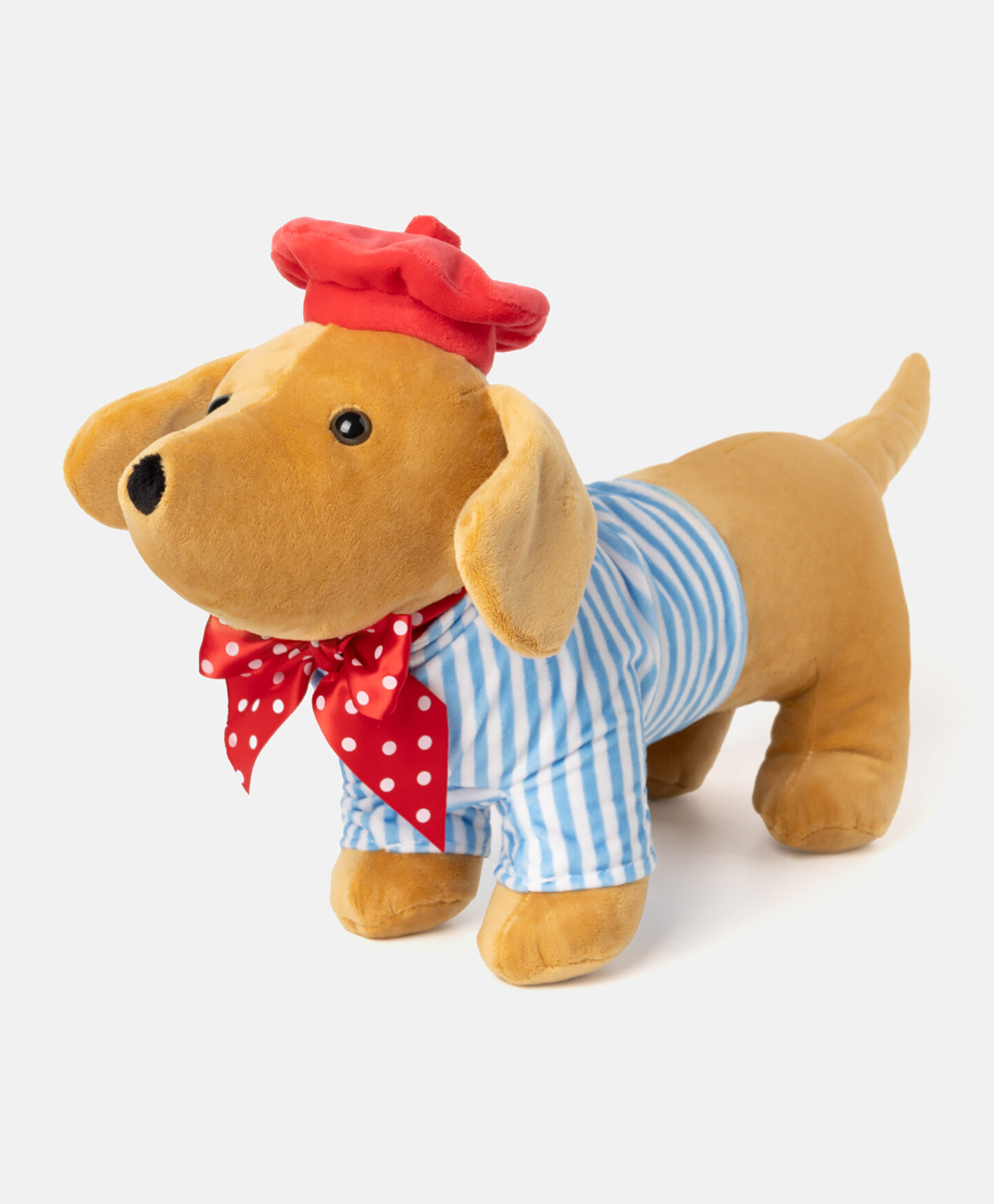 Der Teller aus Steingut mit Dackelmotiv überzeugt durch sein charmantes Design mit einem eleganten Dackel mit Baskenmütze.