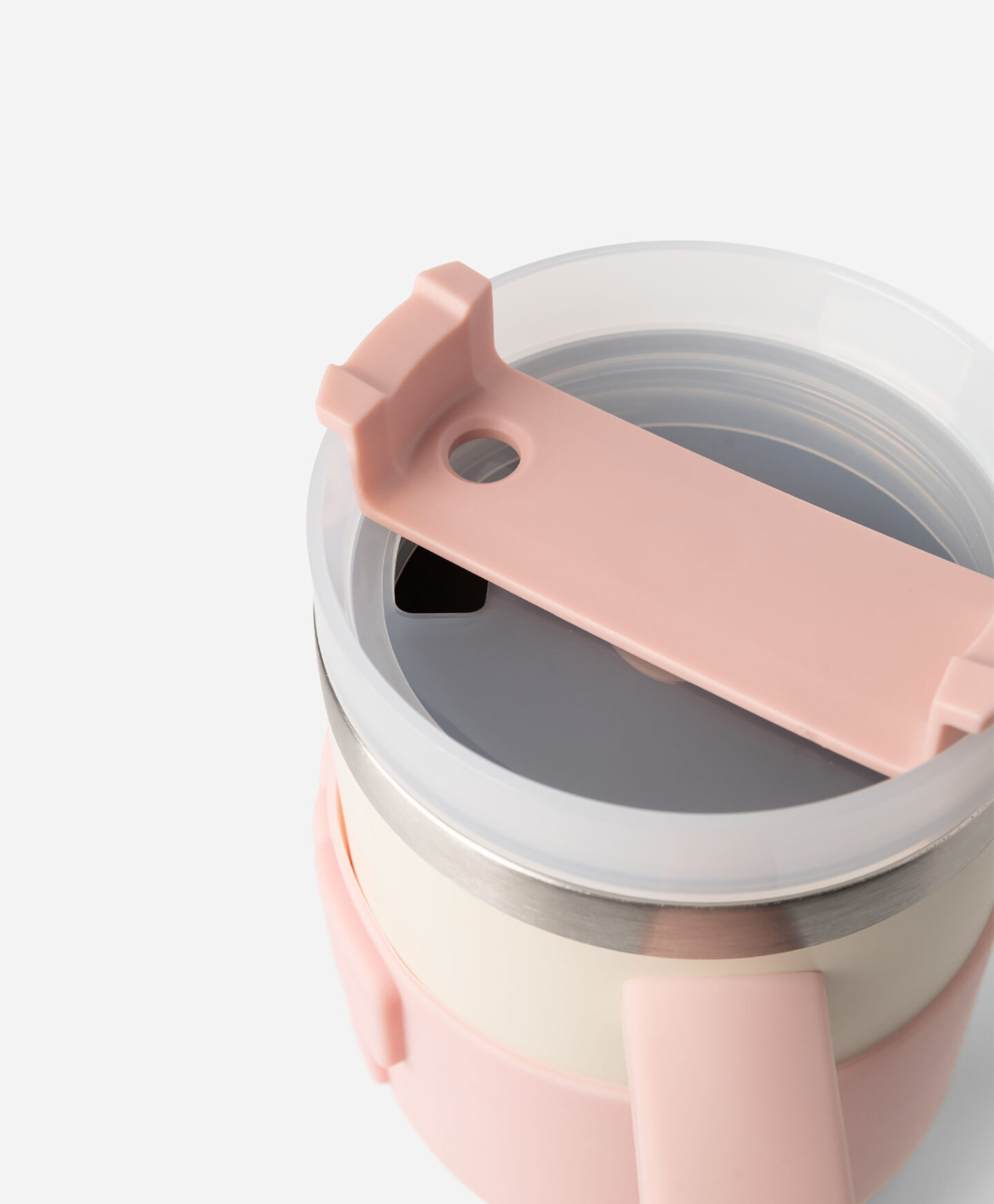 Die Thermotasse mit Strohhalm und Griff ist ein praktischer Begleiter für unterwegs.