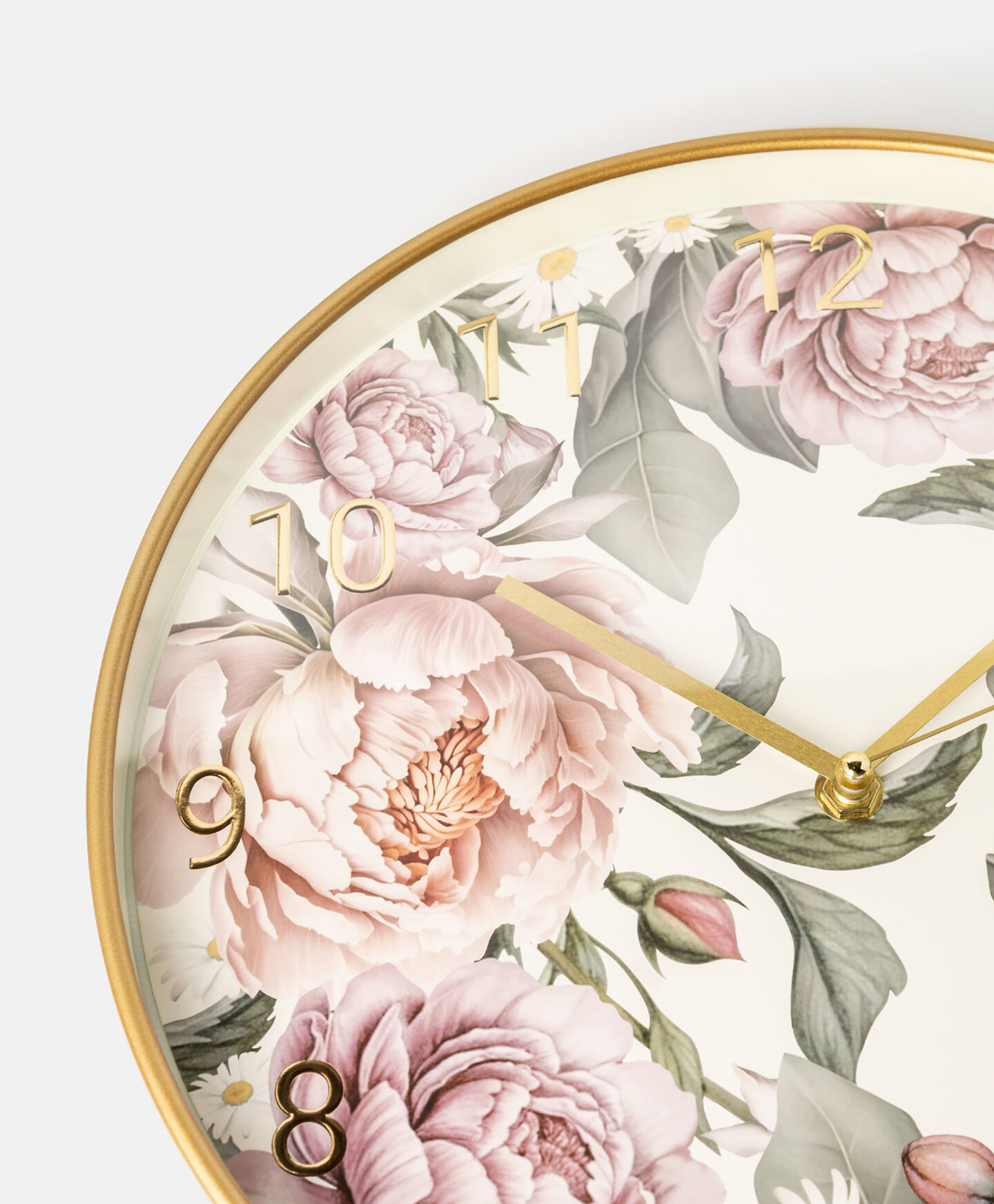 Die Wanduhr mit Blumenmuster zeigt nicht nur die Zeit an, sondern verschönert auch den Raum.