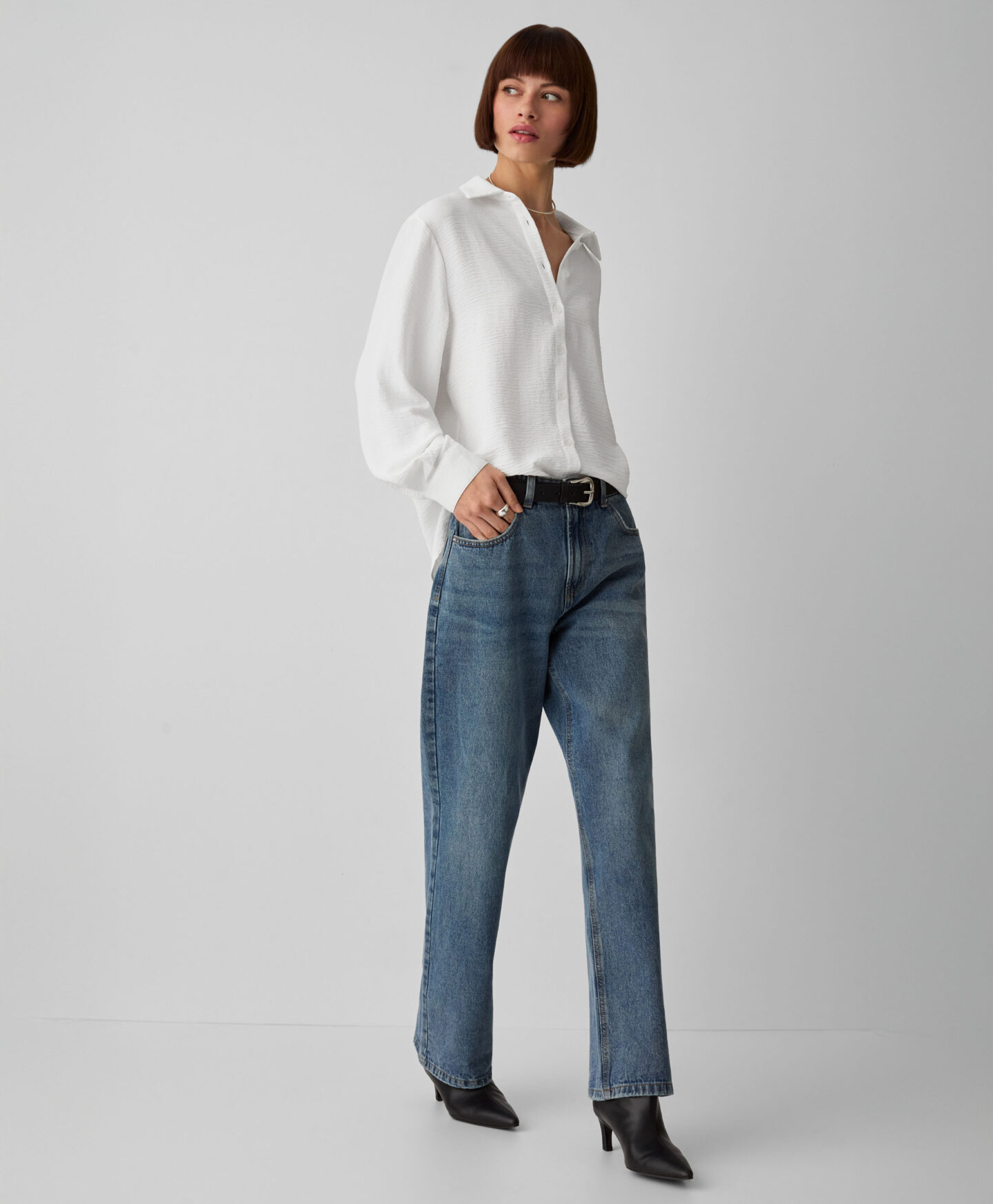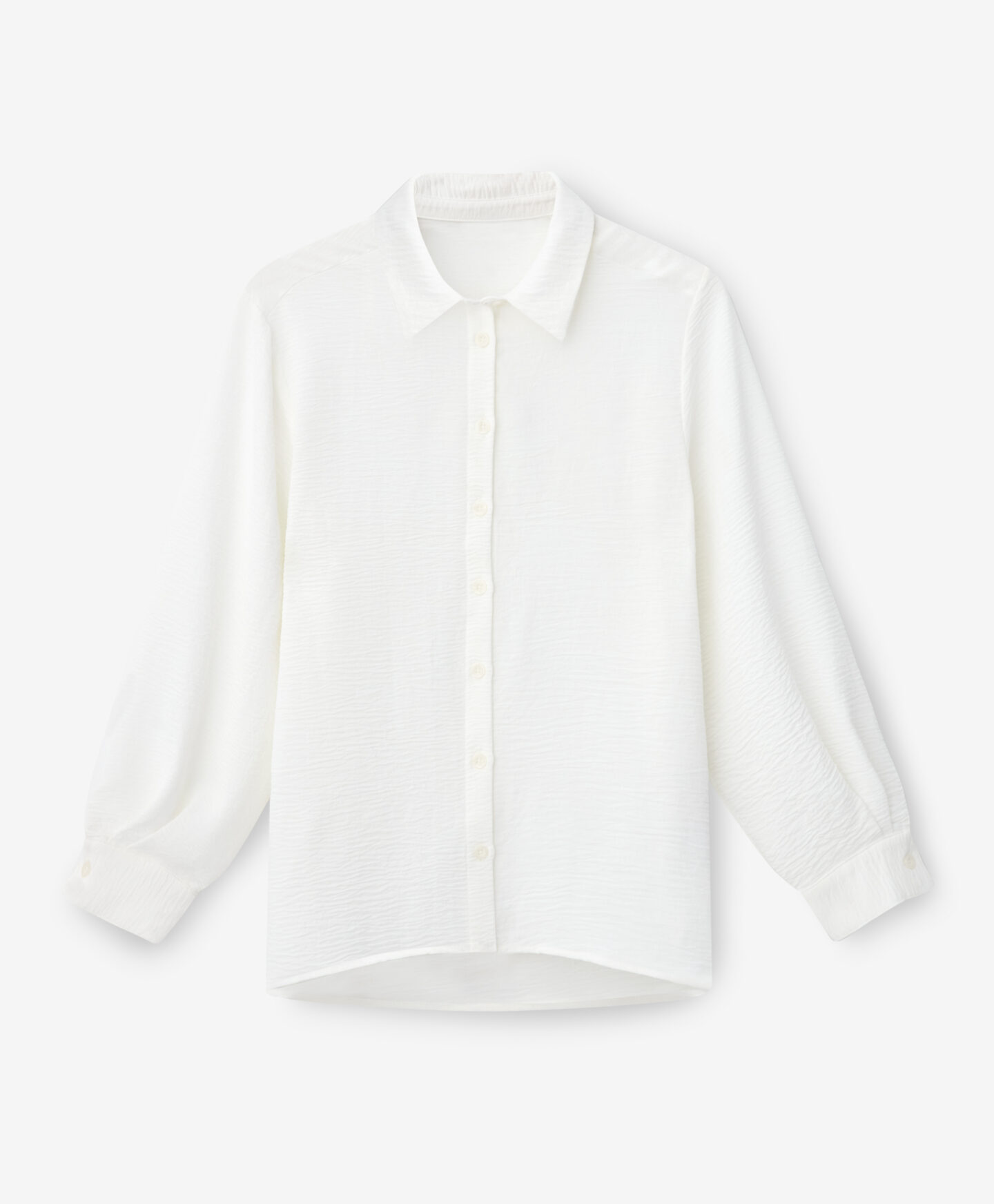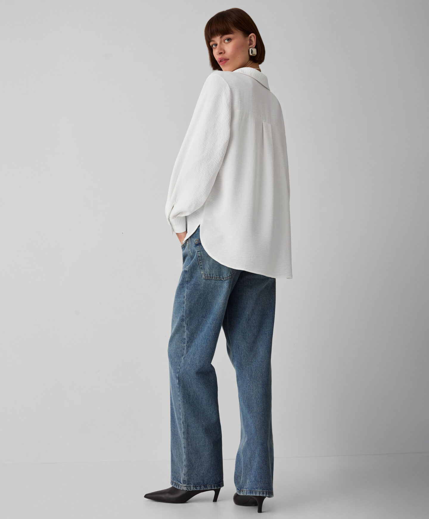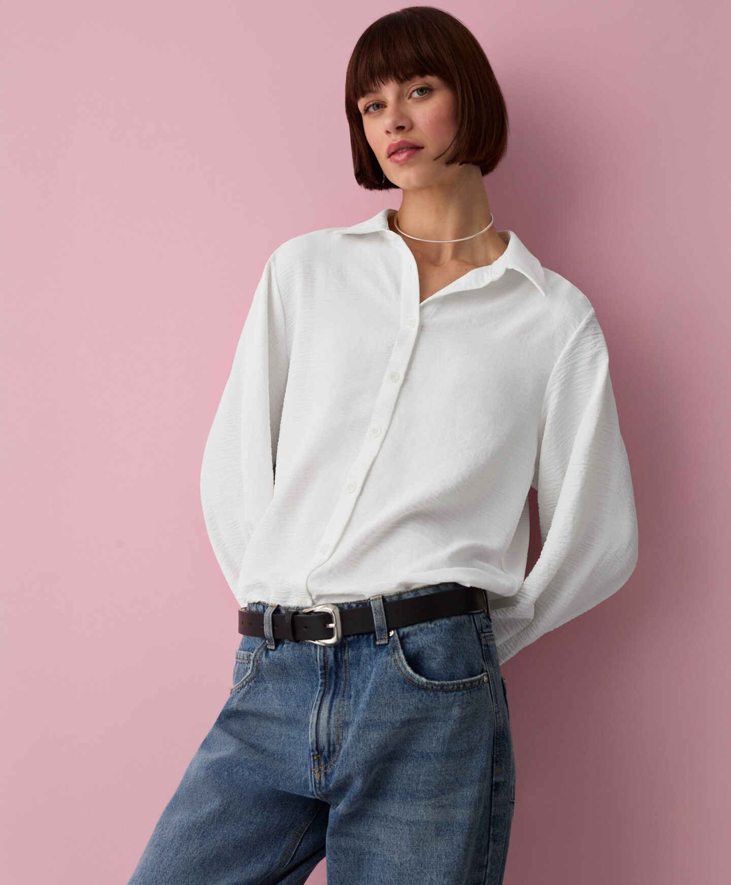 Weißes Shirt für Damen – Das Shirt für Damen ist ein Vorschlag für Liebhaber klassischer Stile mit modernem Twist. Es besticht durch zeitloses Weiß, einen eleganten Kragen und einen lockeren Schnitt, während die Raffung über die gesamte Länge Charakter verleiht. Es sieht besonders gut aus in Kombination mit Jeans oder eleganten Hosen.
