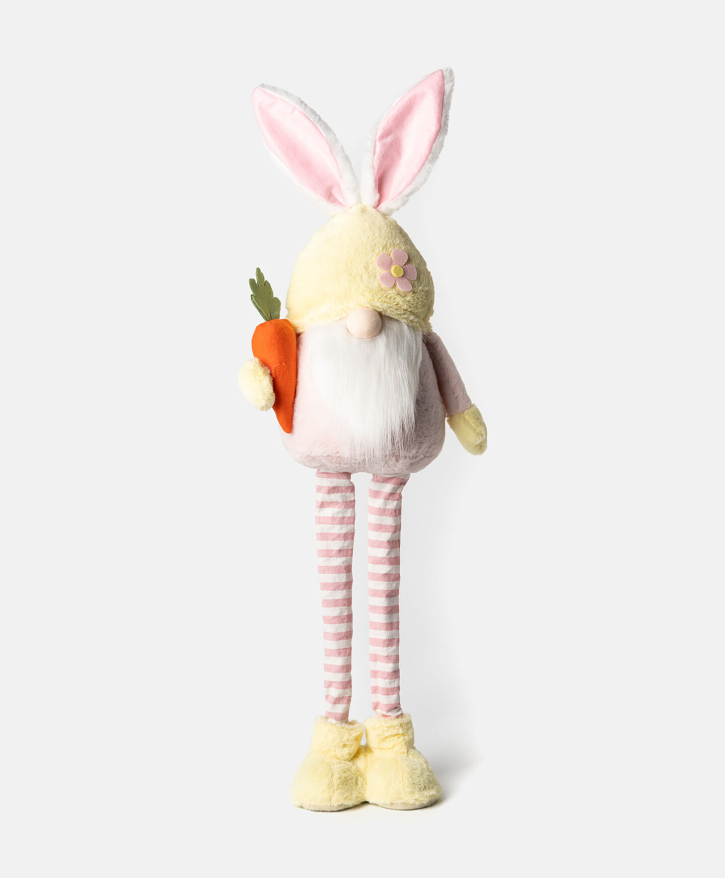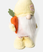Der Wichtel auf Teleskopbeinen mit Karotte ist eine dekorative Figur für saisonale Arrangements.